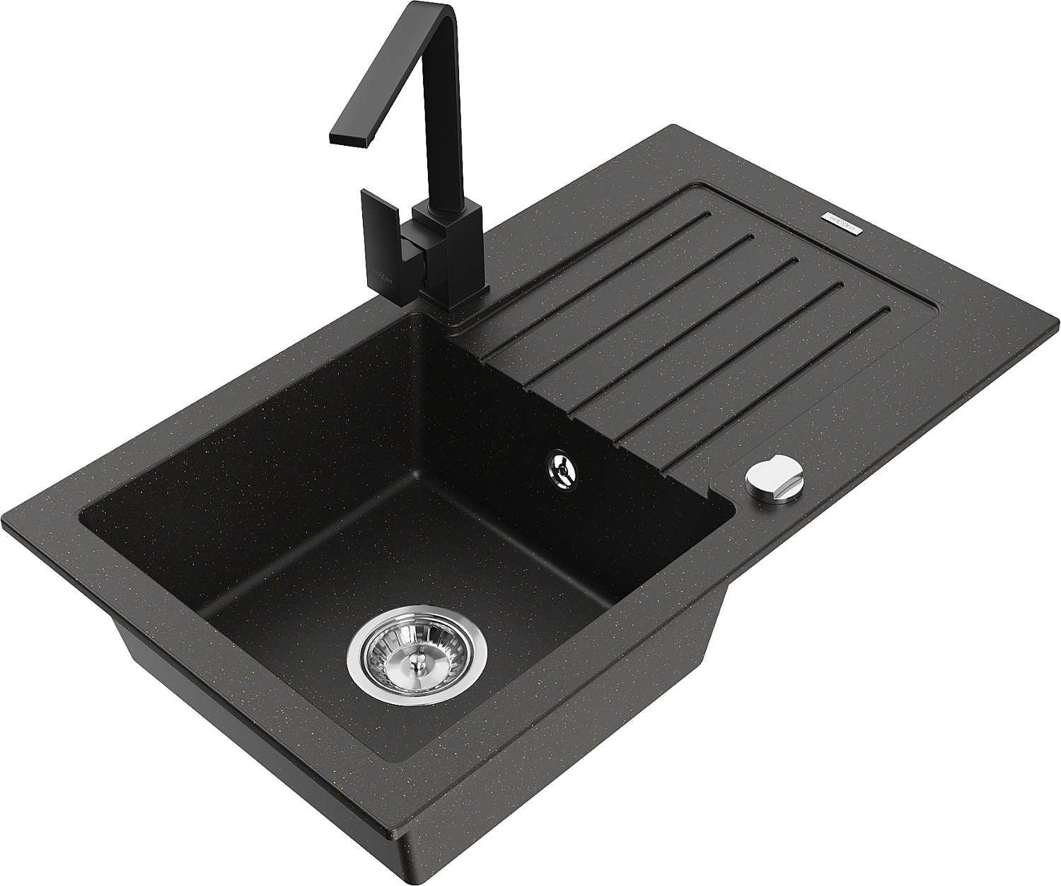 Mexen Pablo 1-skylių granitinis virtuvės kriauklė su nusausinimo vieta ir virtuvės maišytuvu Rita, juodas/auksinis