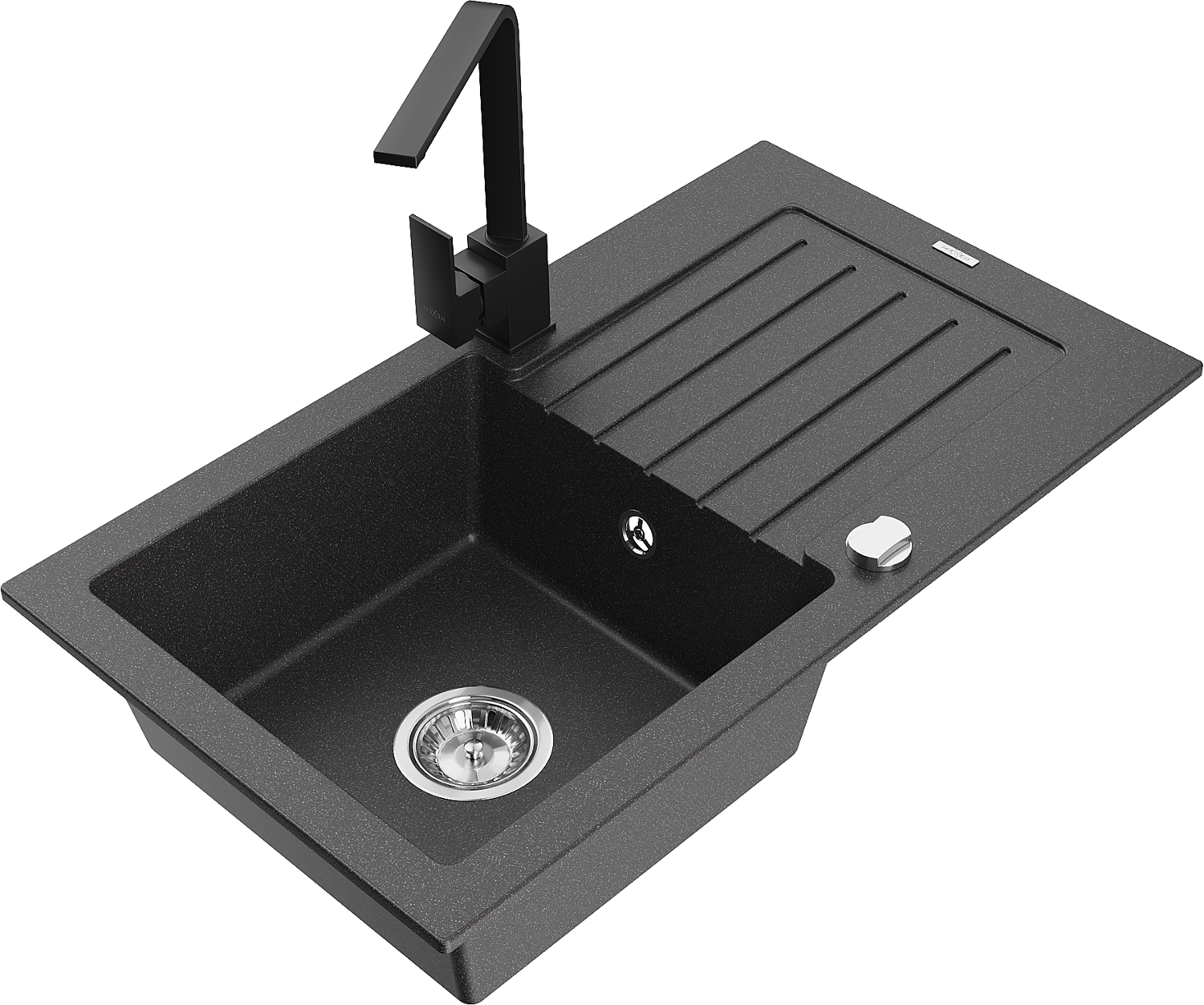 Mexen Pablo vienos kameros granitinė kriauklė su nutekamu ir virtuvės maišytuvu Rita, juoda dėmetė - 6510-76-670300-70
