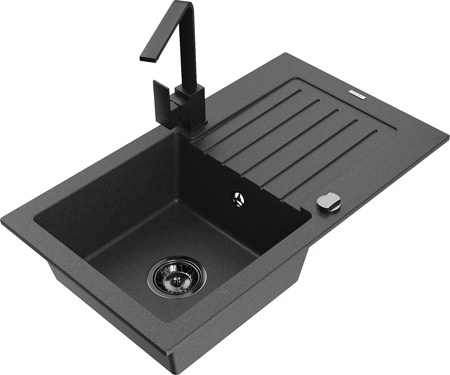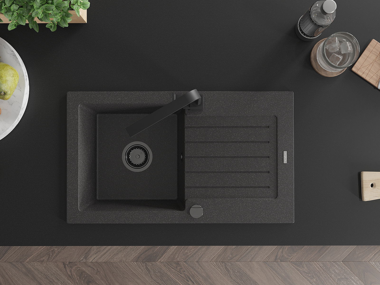 Mexen Pablo 1 skyrių granitinė plautuvė su nuvarvėjimu ir virtuviniu maišytuvu Rita, juoda dėmėta - 6510-76-670300-70-B