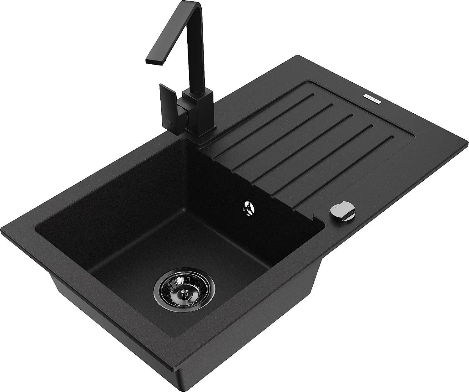 Mexen Pablo vieno dubens granitinė plautuvė su nusausinimo vieta ir virtuvinis maišytuvas Rita, juoda - 6510-77-670300-70-B