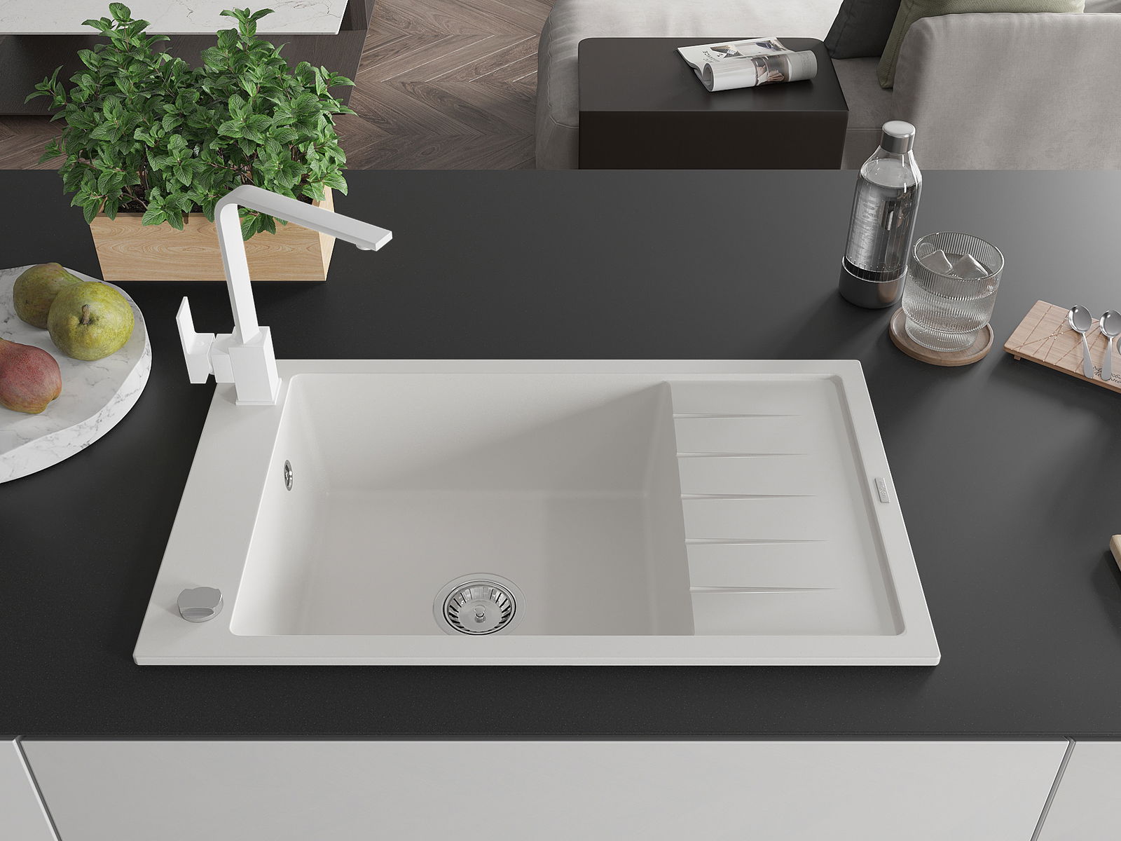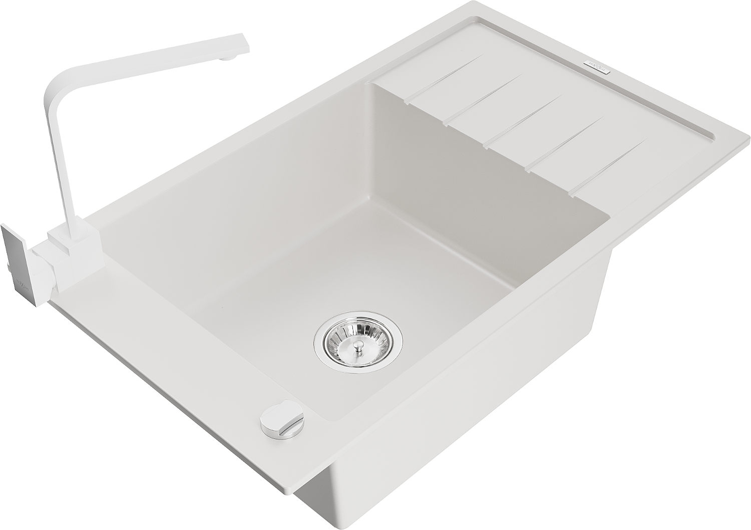 Mexen Elias granitinis vienos kameros plautuvė su nutekėjimu ir virtuviniu maišytuvu Rita, balta - 6511-20-670300-20