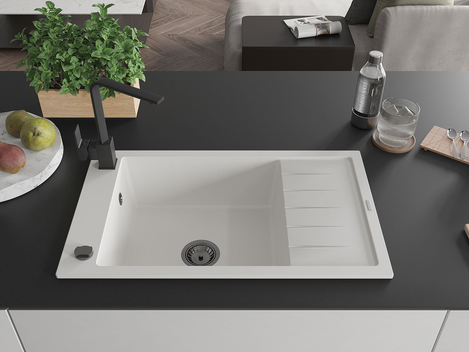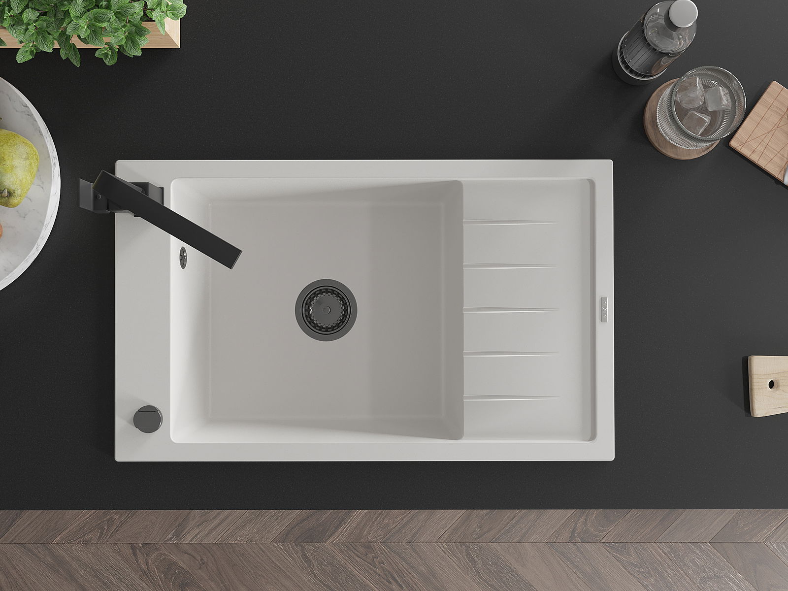 Mexen Elias granitinis vienos talpos plautuvė su nutekėjimu ir virtuviniu maišytuvu Rita, balta - 6511-20-670300-70