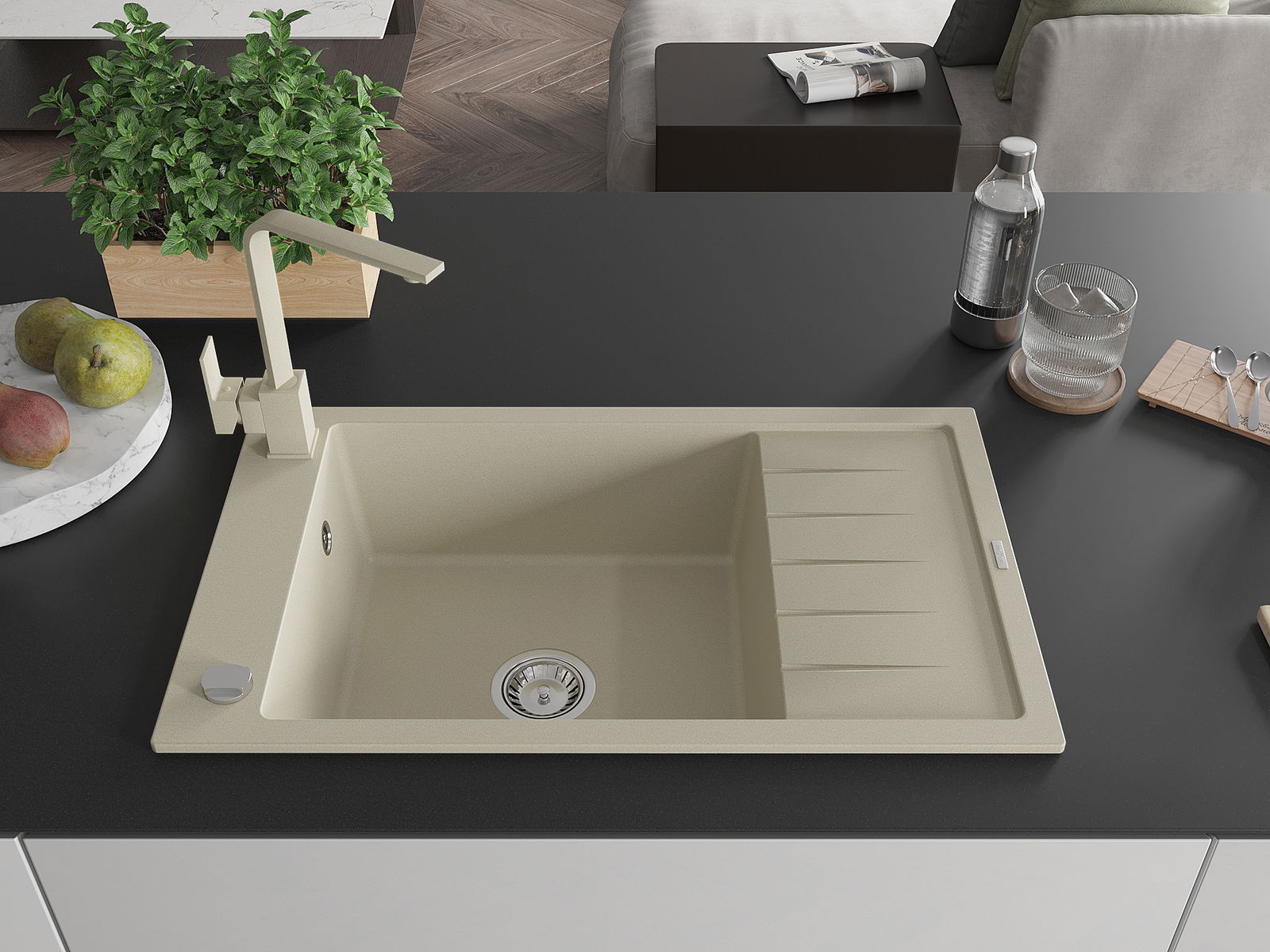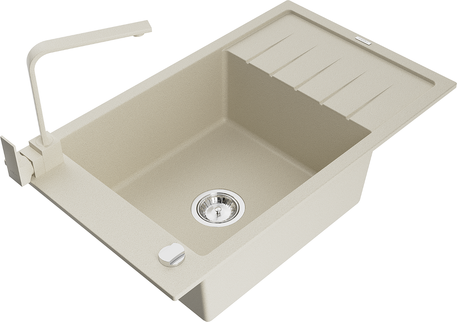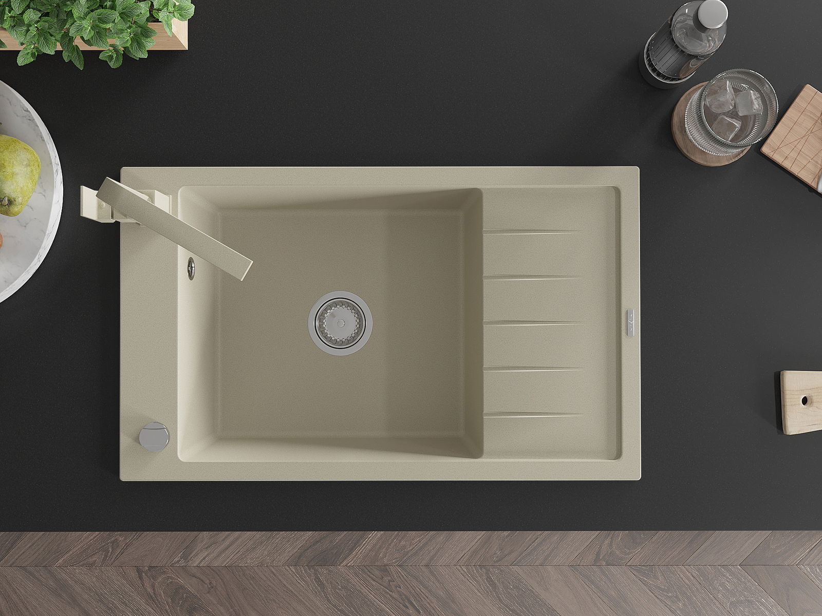 Mexen Elias granitinė vienos kameros plautuvė su nusausintuvu ir virtuviniu maišytuvu Rita, smėlio spalvos