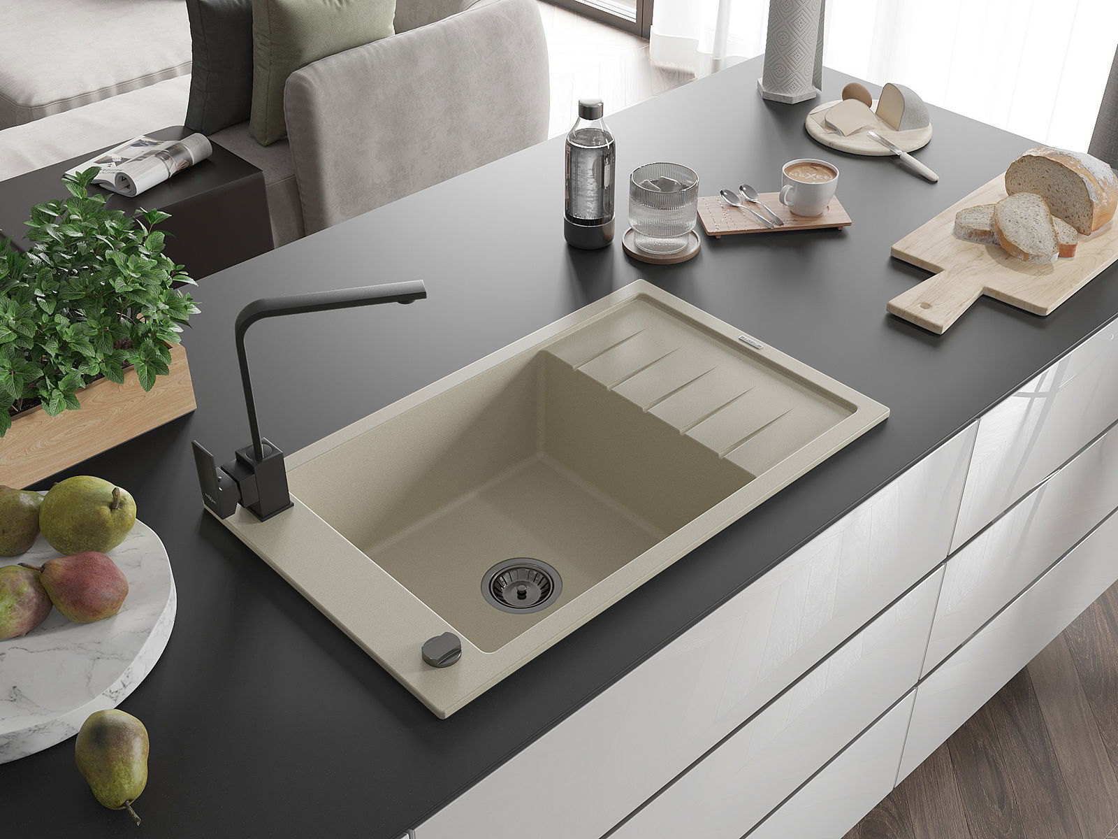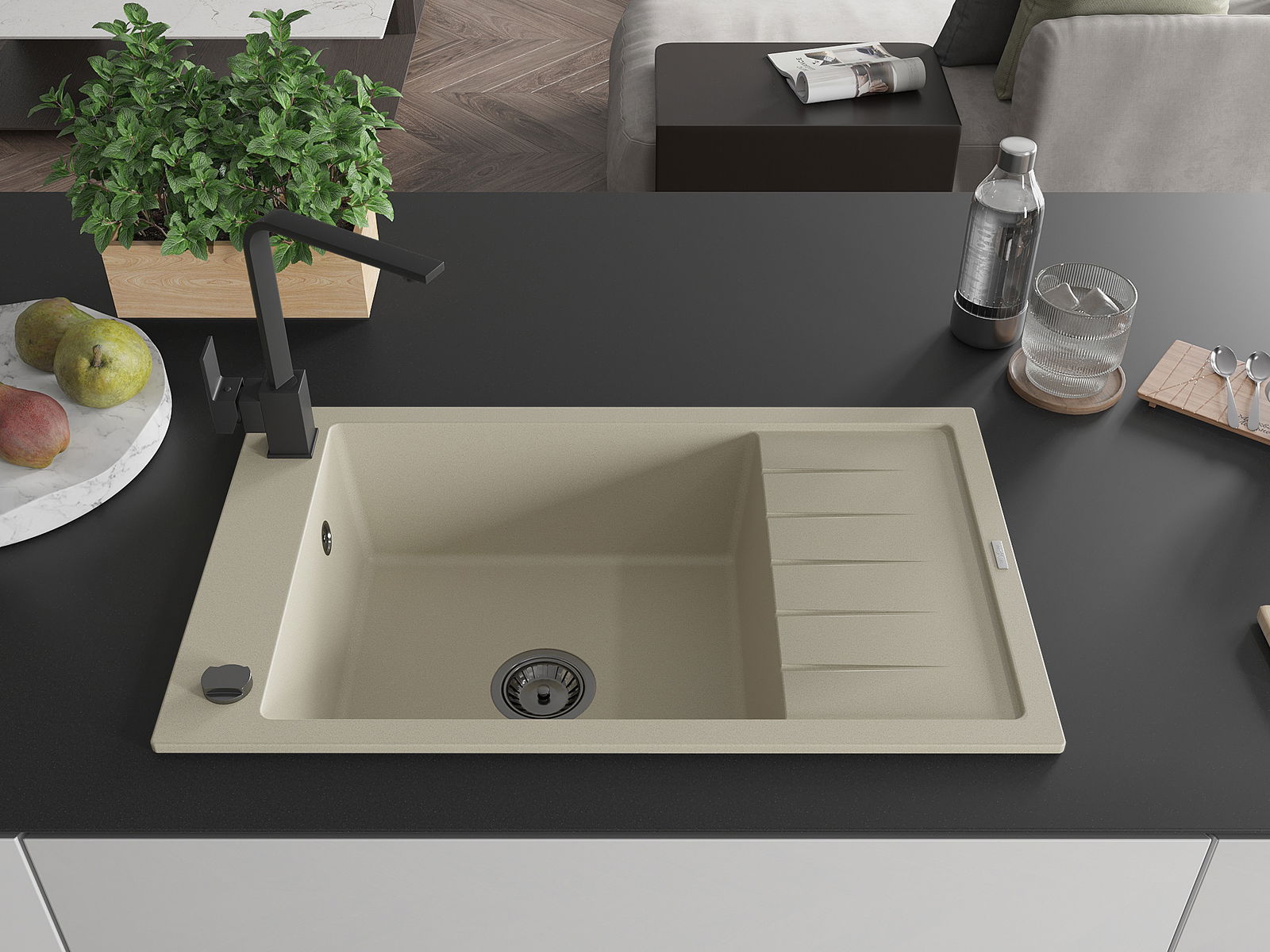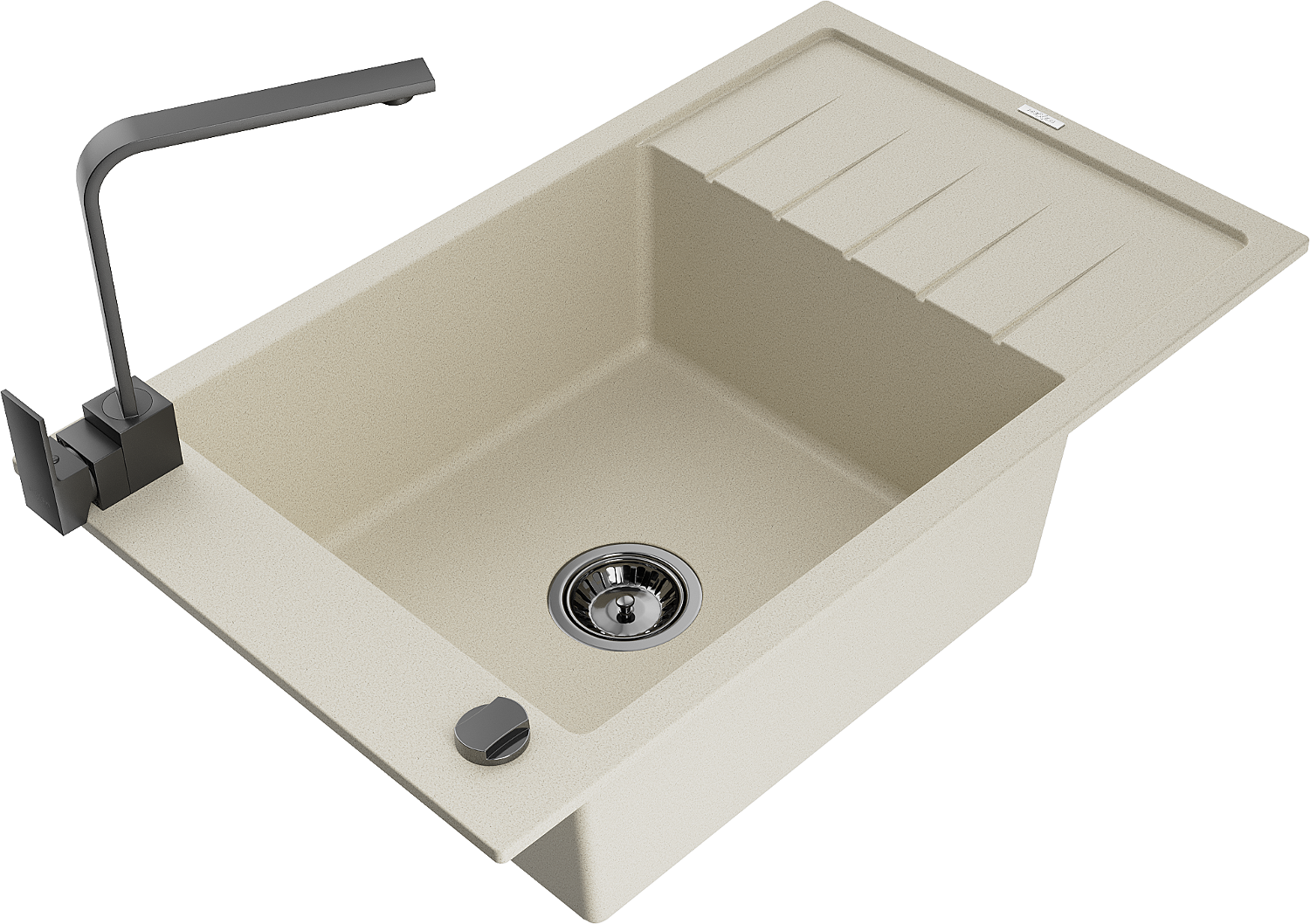 Mexen Elias granitinė vienos kameros kriauklė su nutekėjimu ir virtuviniu maišytuvu Rita, smėlio spalvos
