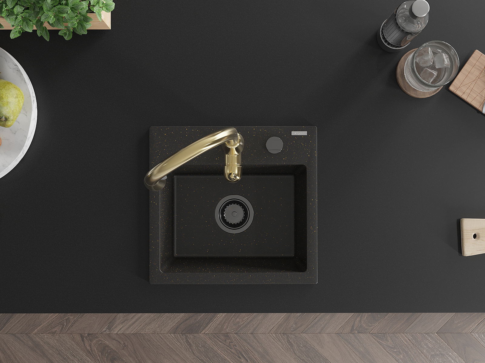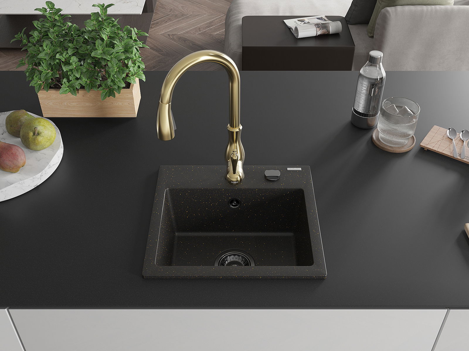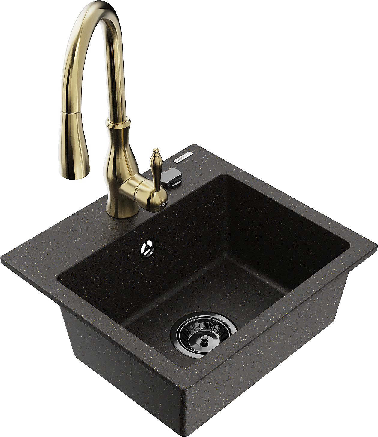 Mexen Milo granitinė vienos kameros virtuvės kriauklė su Savita virtuvės čiaupu, juoda/auksinė metalo spalva