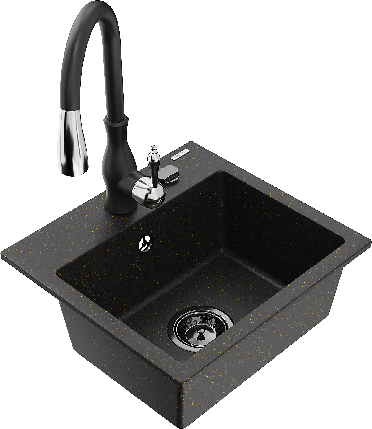 Mexen Milo 1-skyrių granitinis kriauklė su virtuviniu maišytuvu Savita, juodas/aukso metalikas - 6505-75-672601-70-B