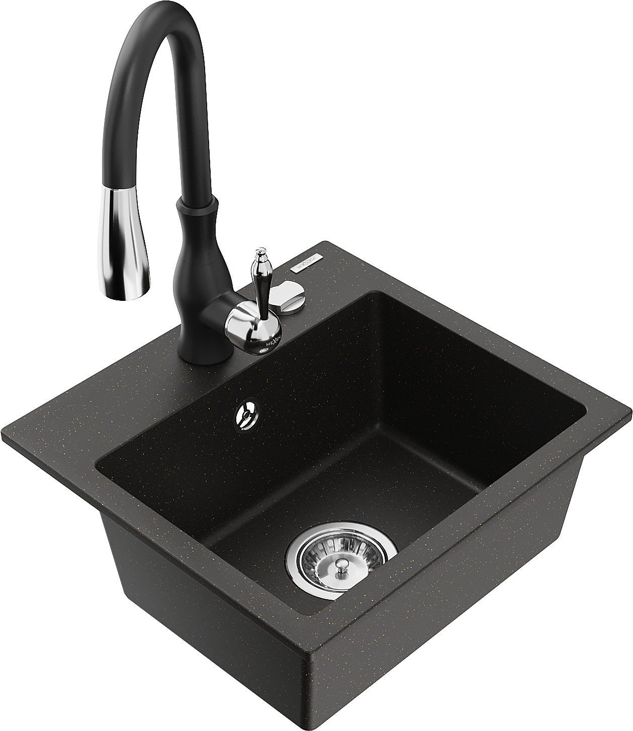 Mexen Milo granito vienos sekcijos virtuvinė kriauklė su maišytuvu Savita, juoda/auksinė metalo spalva - 6505-75-672601-70