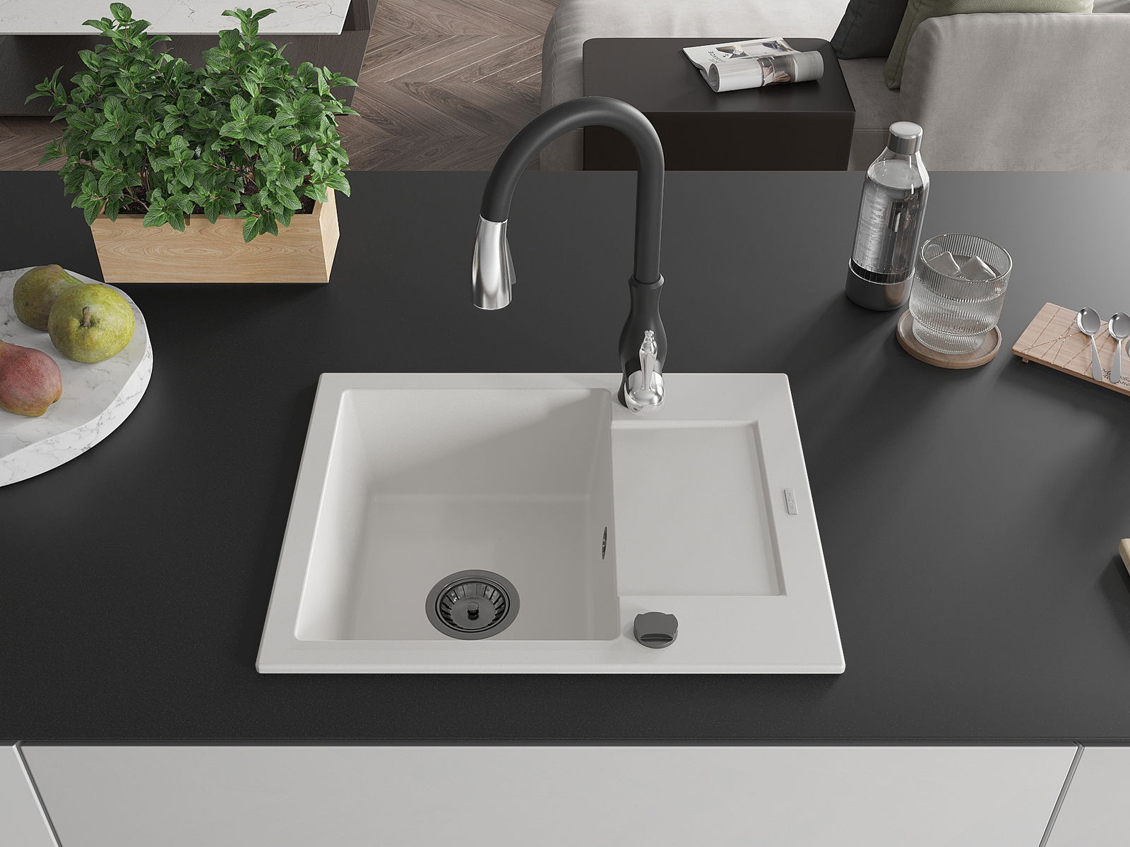 Mexen Enzo granitinė plautuvė 1 skyrelio su lašintuvu ir virtuviniu maišytuvu Savita, balta - 6506-20-672601-70