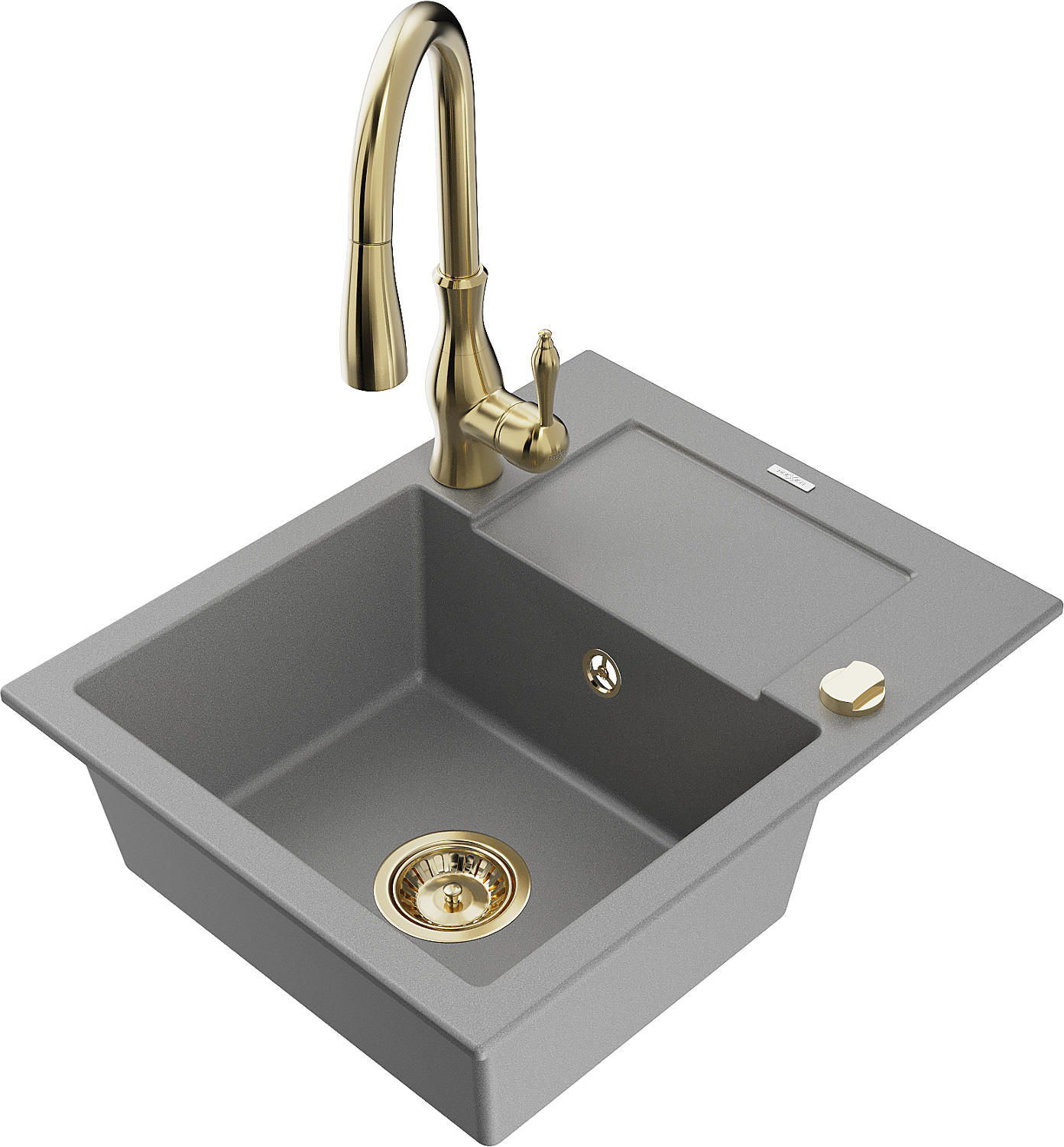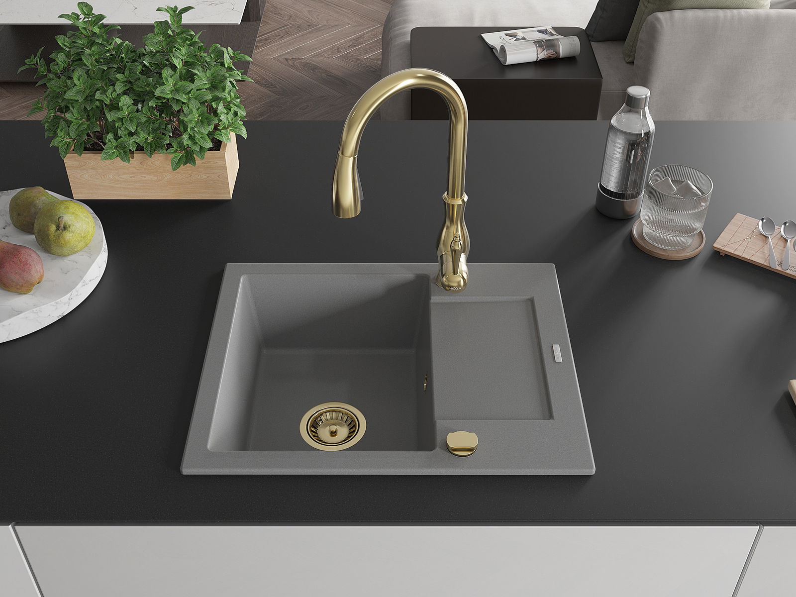 Mexen Enzo granitinė 1 skyrelio kriauklė su varvykla ir virtuviniu maišytuvu Savita, pilka - 6506-71-672601-50