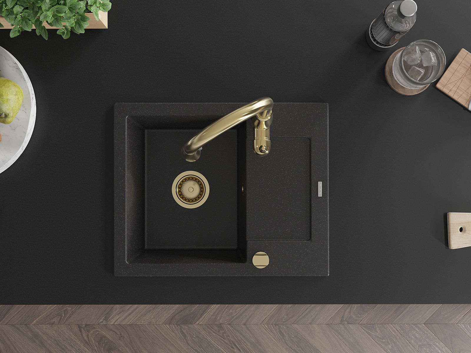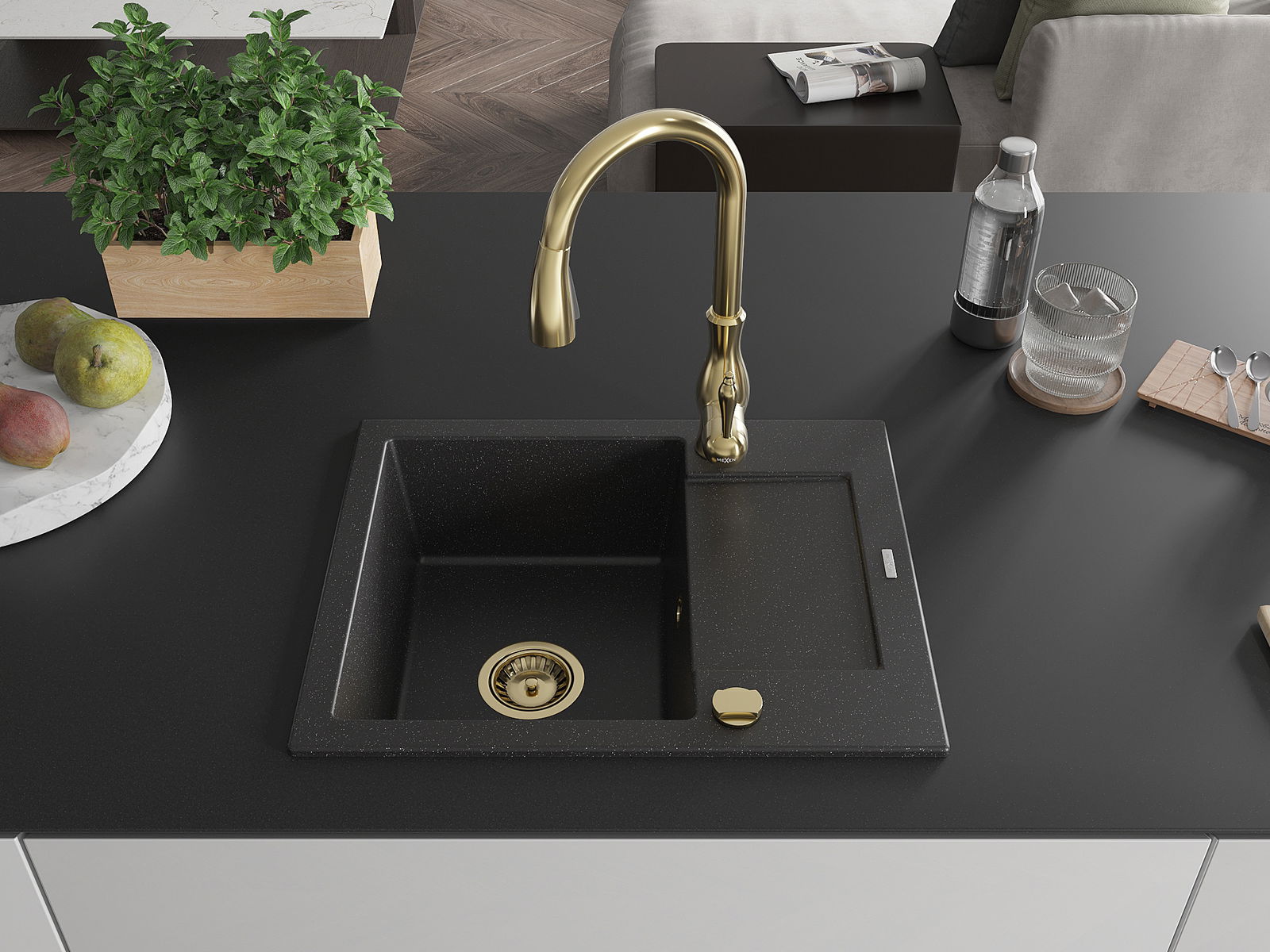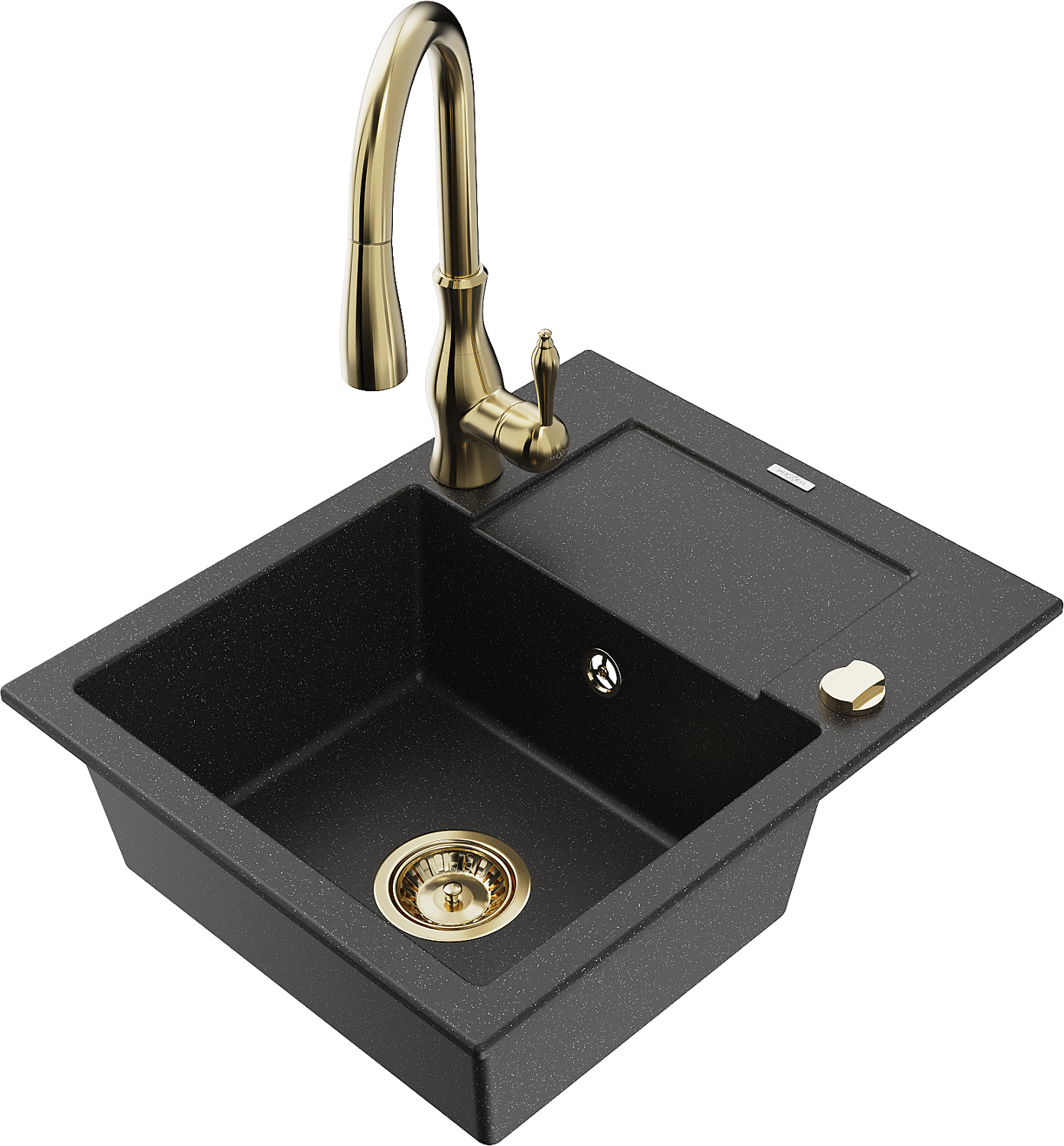 Mexen Enzo vienos kameros granitinė kriauklė su nusausinimo vieta ir virtuviniu maišytuvu Savita, juoda/sidabrinė metalika