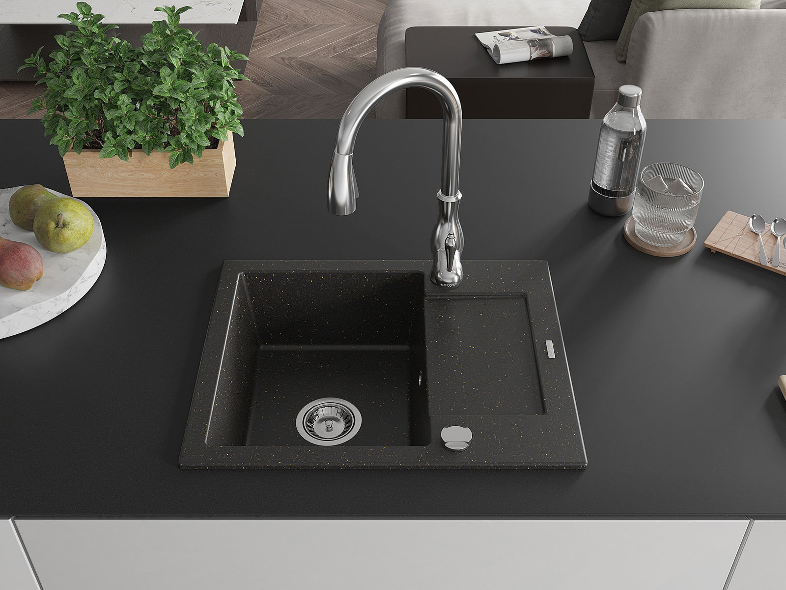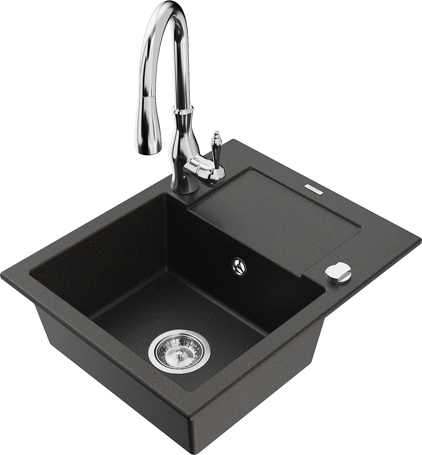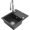 Mexen Enzo granitinė kriauklė 1-sekcijinė su nusausintuvu ir Savita virtuviniu maišytuvu, juoda/auksinis metalikas