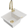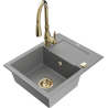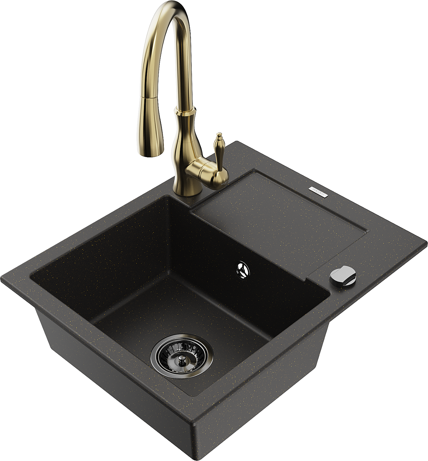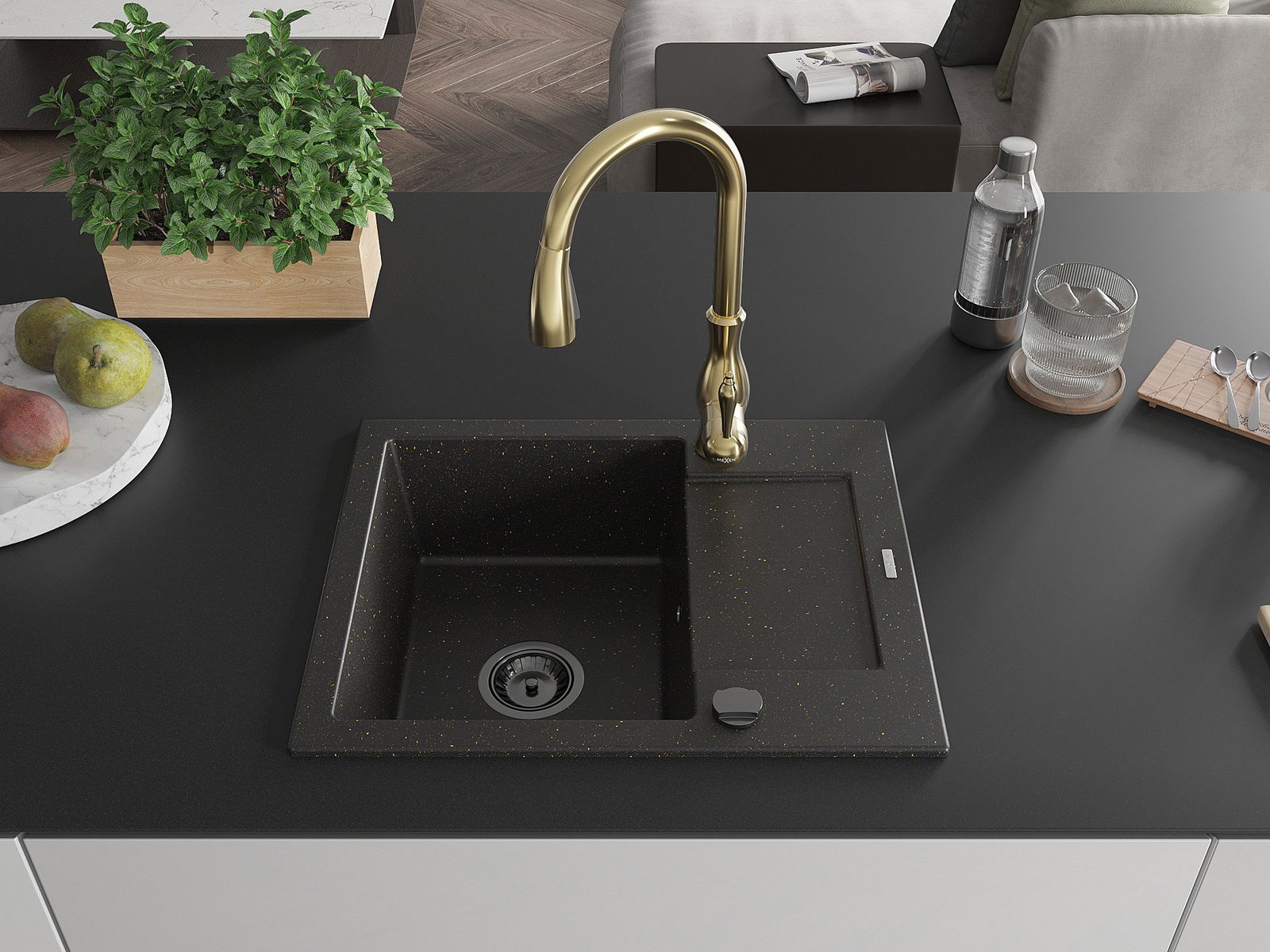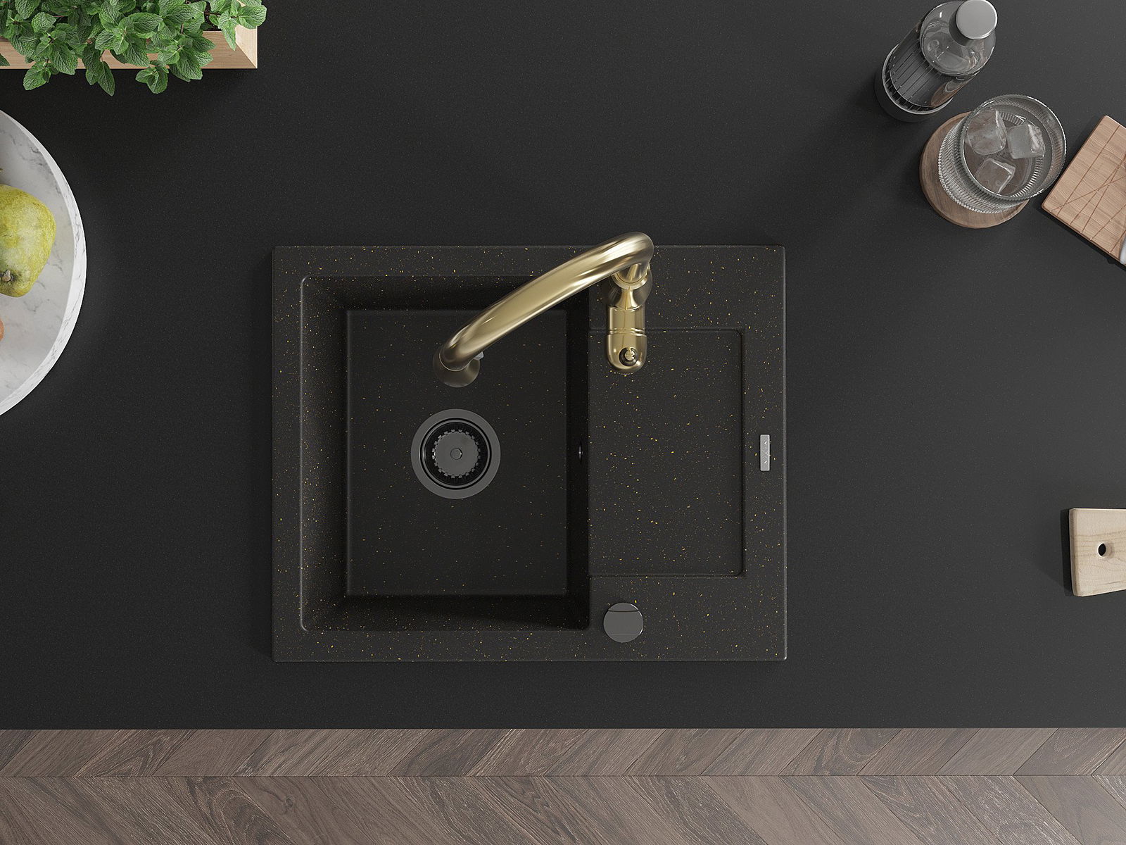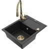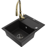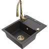 Mexen Enzo granitinė vienos kameros plautuvė su nusausinimo paviršiumi ir virtuviniu maišytuvu Savita, juoda/auksinis