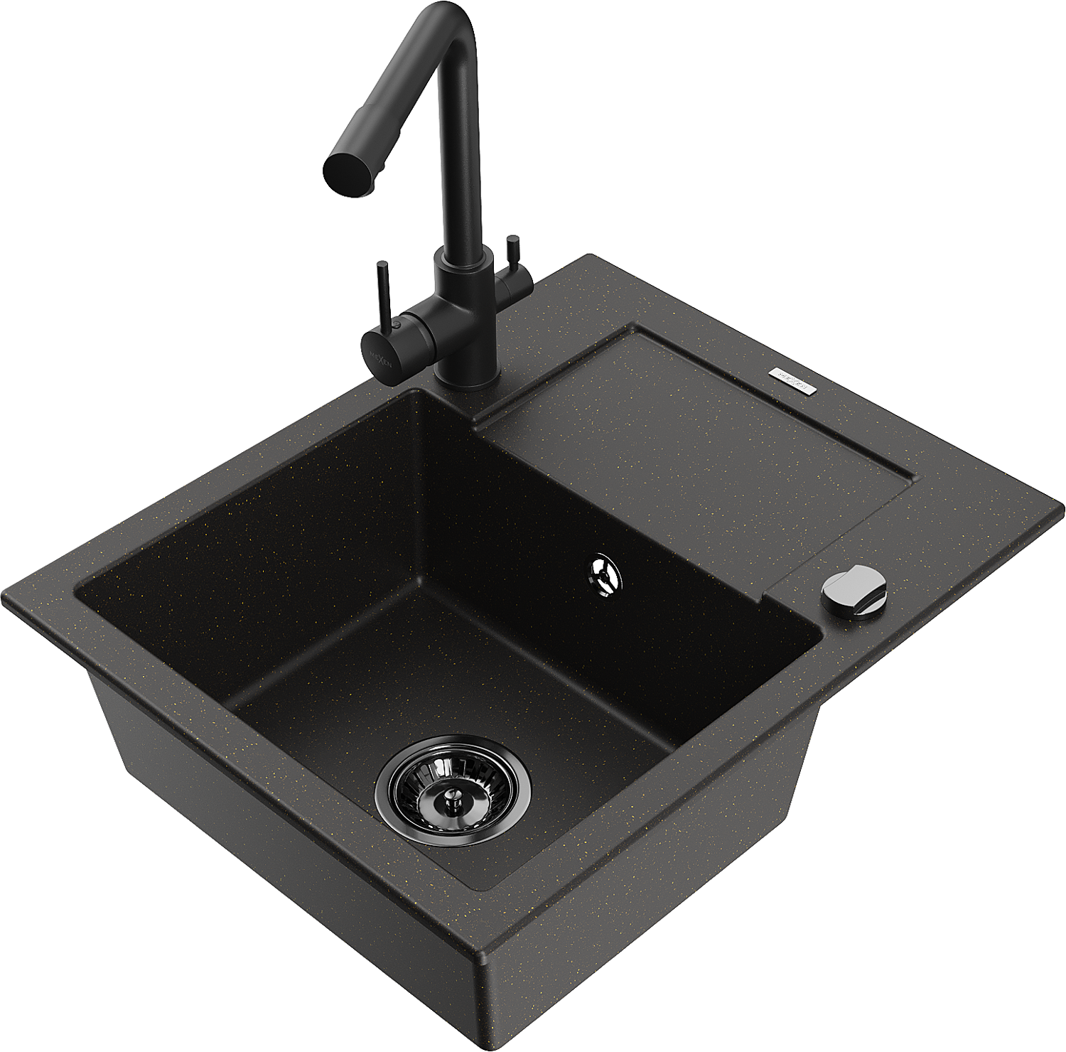 Mexen Enzo 1 skyriuje granito plautuvė su nusausintoju ir virtuviniu maišytuvu Duero, juodas/auksinis metalikas