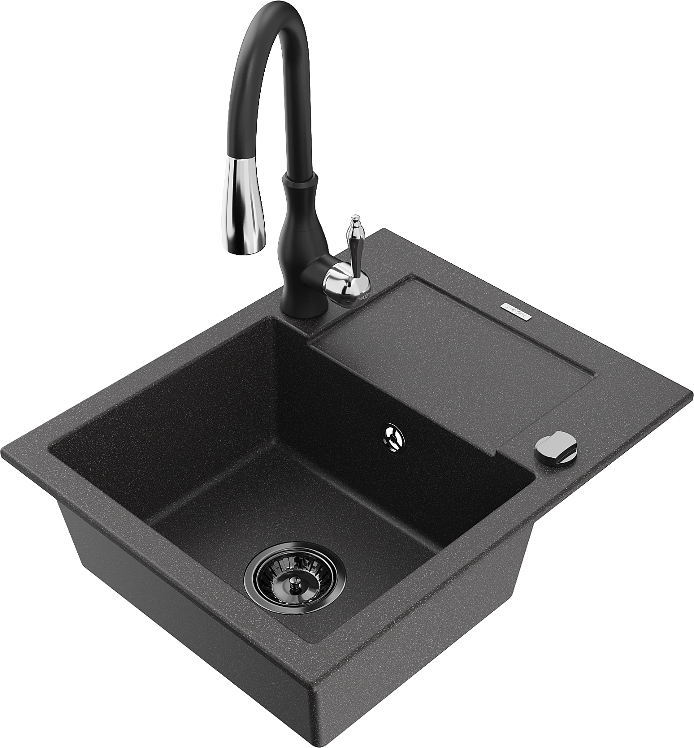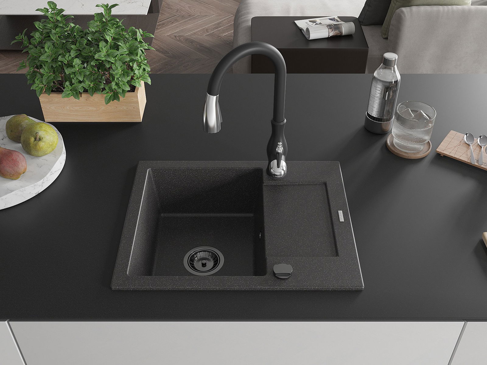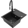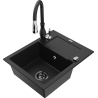 Mexen Enzo granitinė vienos kameros plautuvė su nuvarvėjimo vieta ir virtuviniu maišytuvu Savita, juoda su taškeliais
