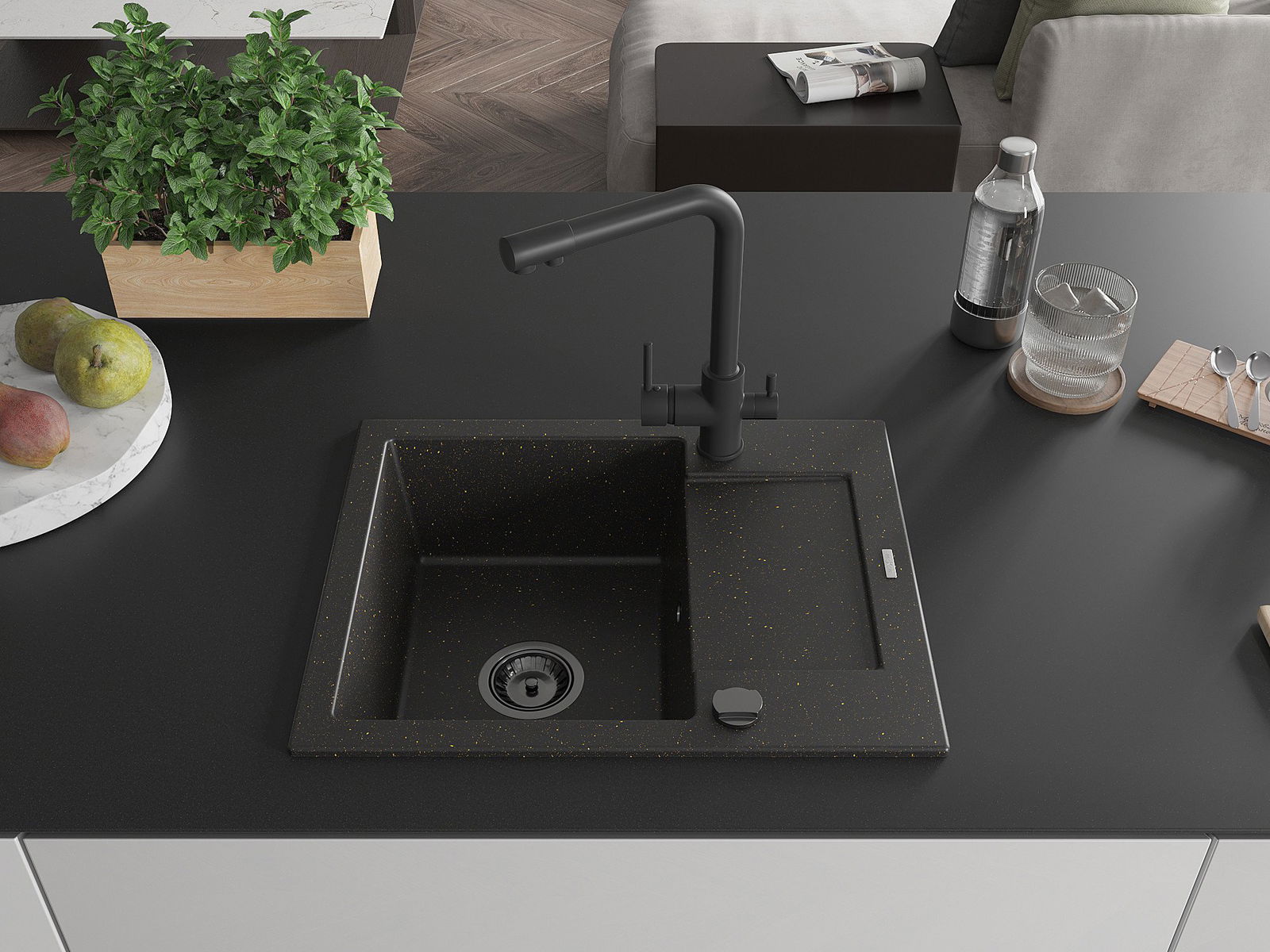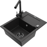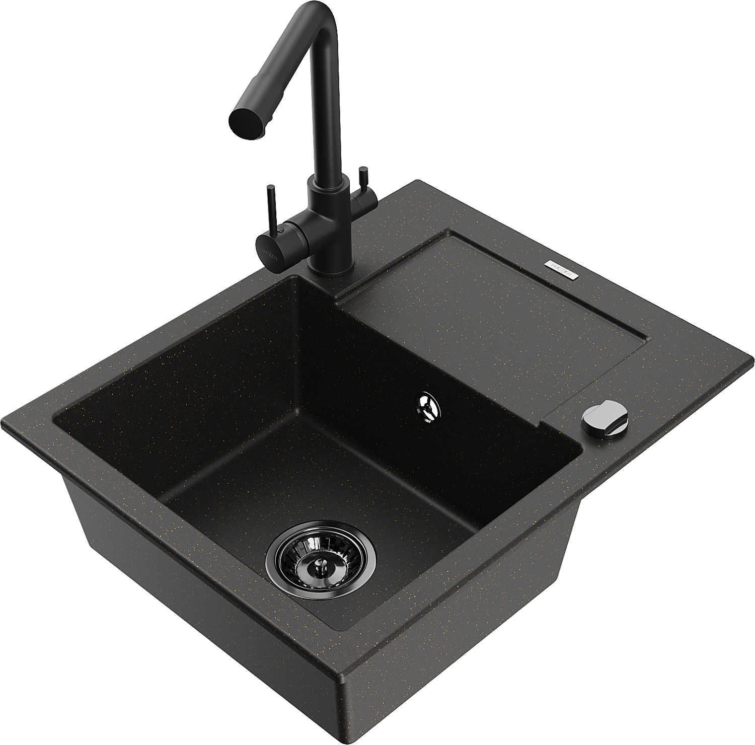 Mexen Enzo vienos komoros granitinė plautuvė su nusausinimo vieta ir virtuviniu maišytuvu Duero, juoda dėmėta