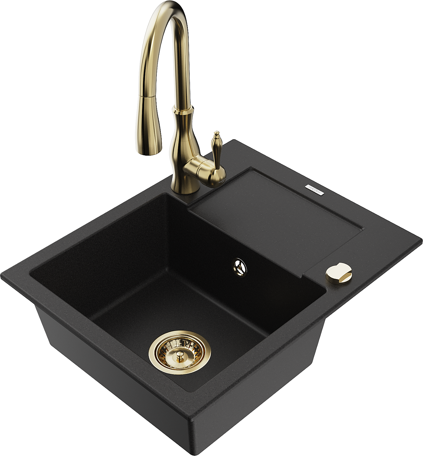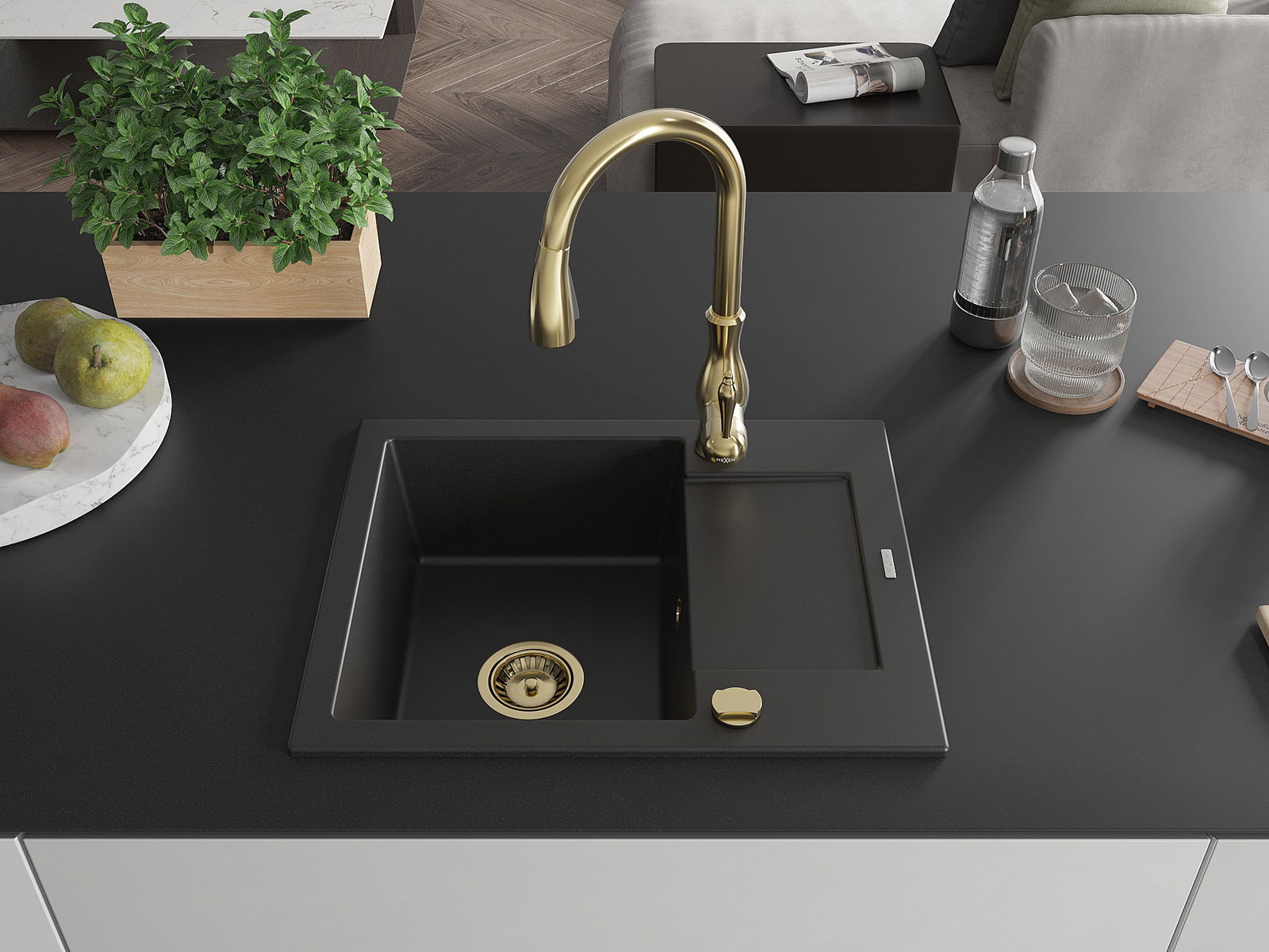 Mexen Enzo granitinė vienos kameros plautuvė su nusausinimo lėkšte ir virtuviniu maišytuvu Savita, juoda - 6506-77-672601-50