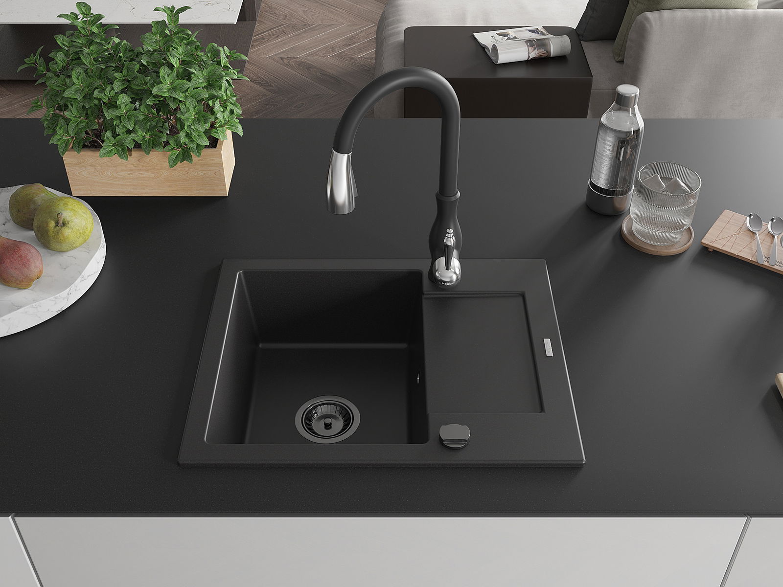 Mexen Enzo granito plautuvė su 1 skyriumi ir nusausinimo sekcija bei virtuviniu maišytuvu Savita, juoda - 6506-77-672601-70-B