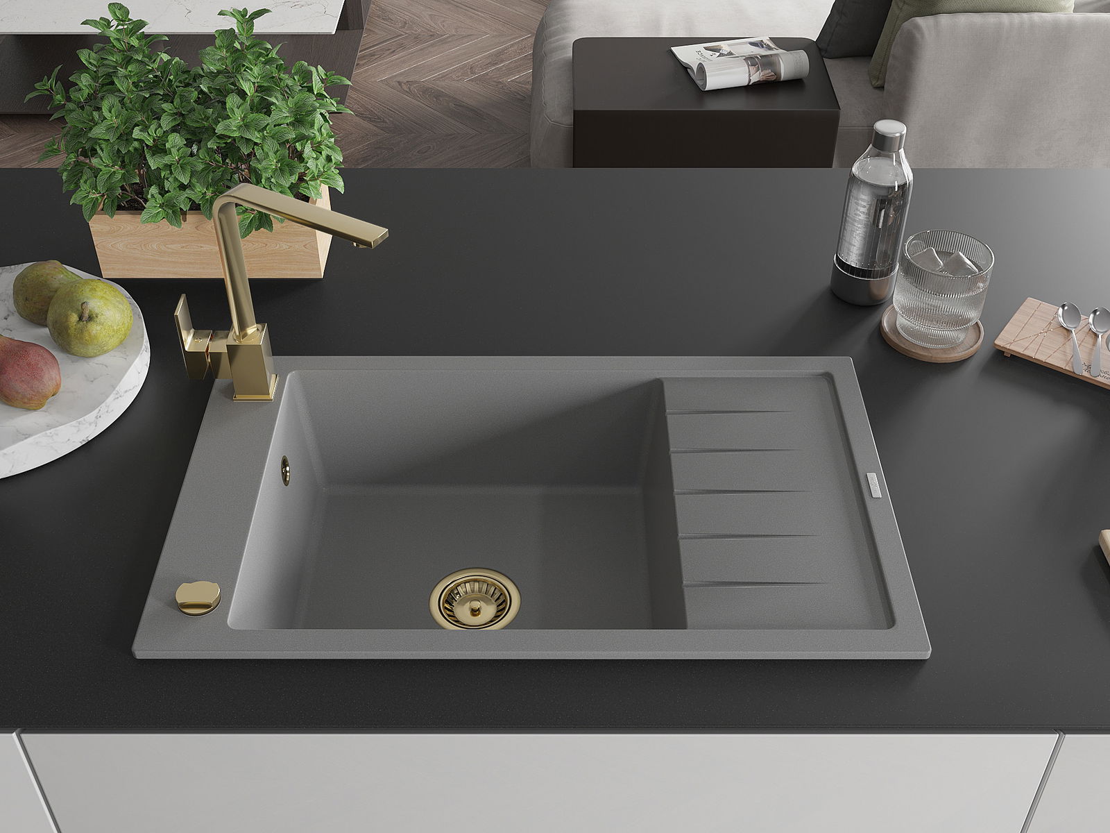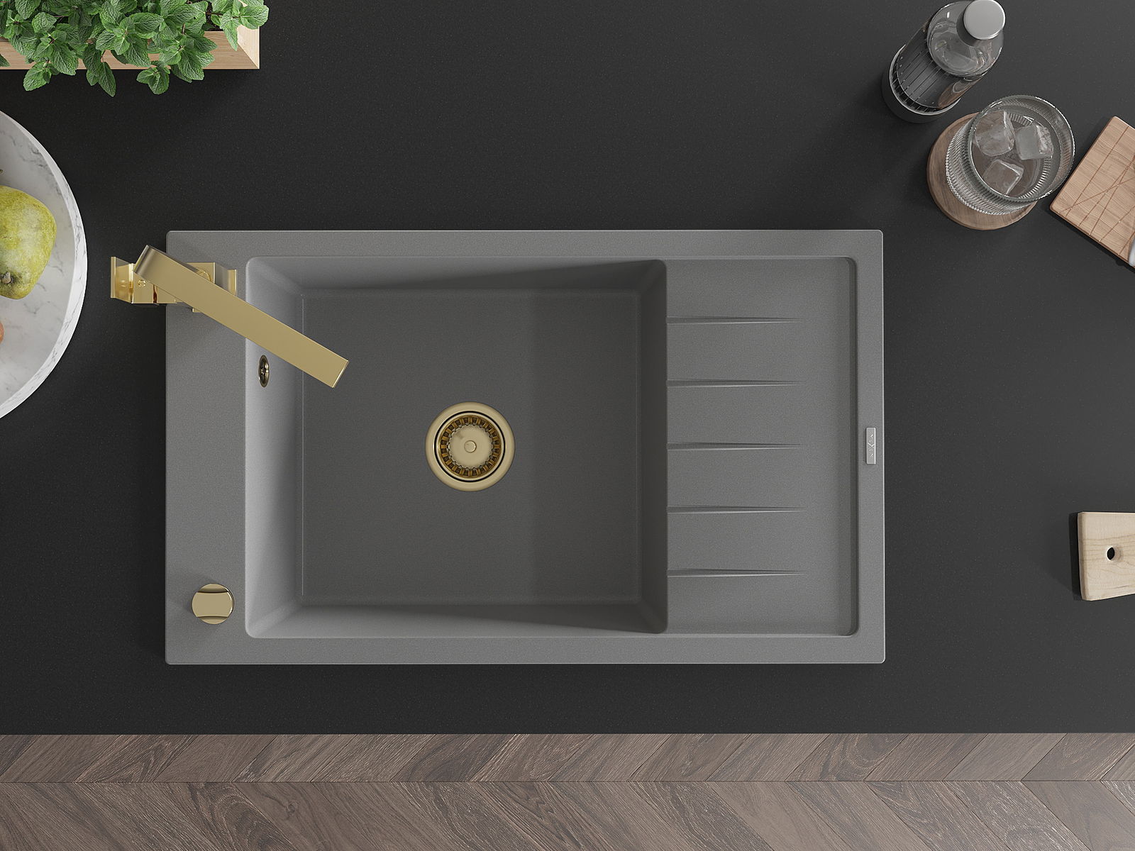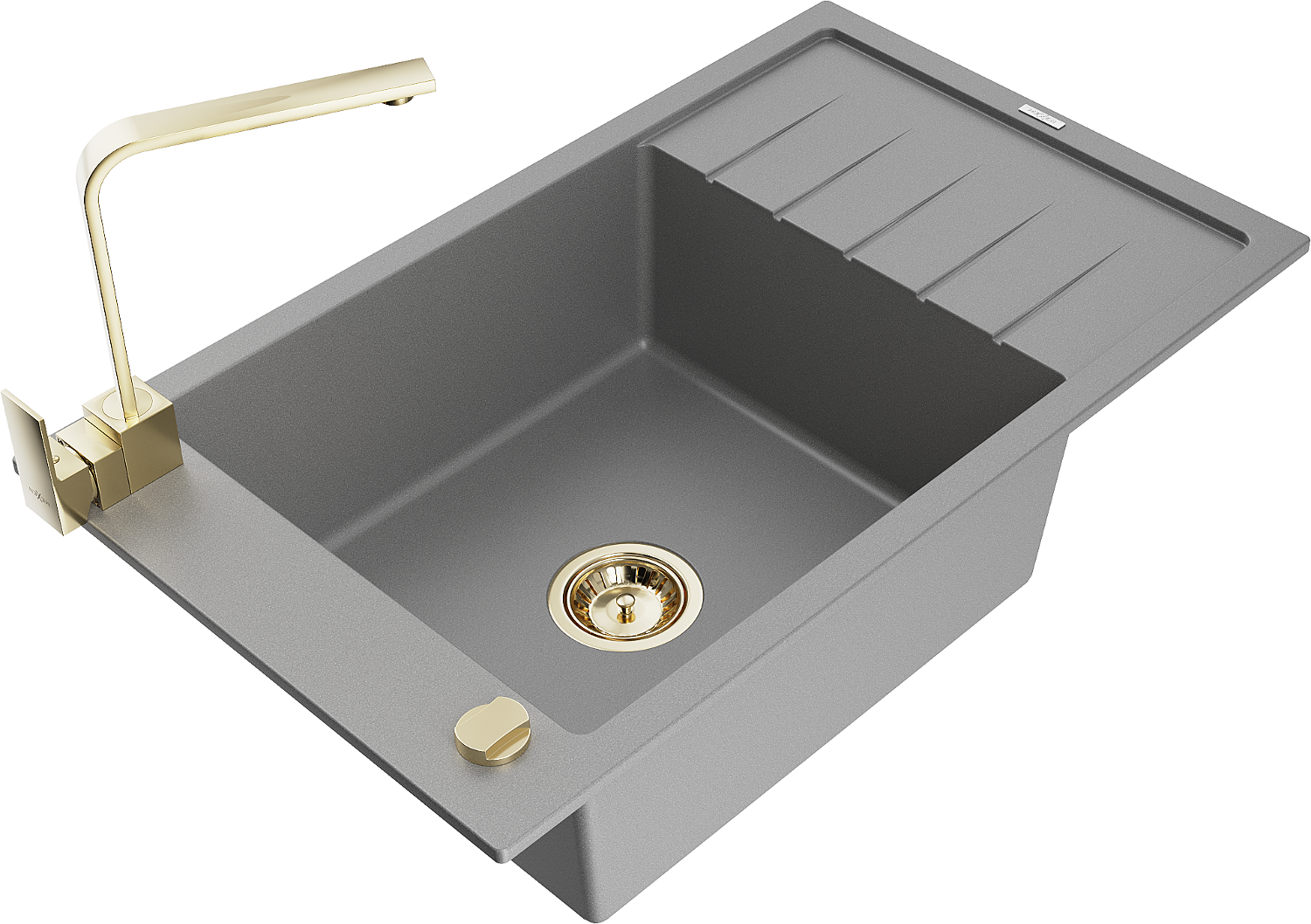 Mexen Elias vienvietis granito kriauklė su sausinimo plokšte ir virtuviniu maišytuvu Rita, pilkas - 6511-71-670300-50