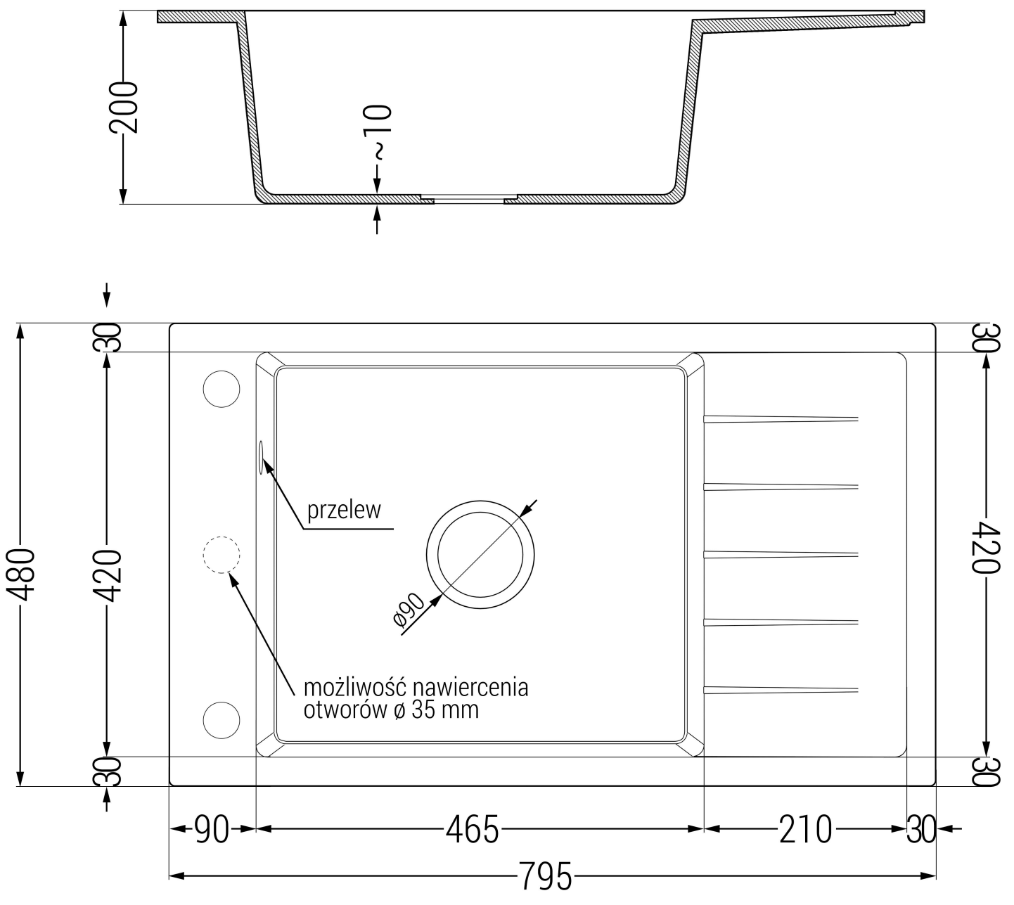 Kriauklė turi išfrezuotą angą, kurios skersmuo 35 mm, kad būtų galima savarankiškai išmušti. Ją galima panaudoti, pvz., montuojant skysto muilo dozatorių, kuris pašalins plastikinių butelių buvimą virtuvėje ir suteiks jai elegantišką apdailą.