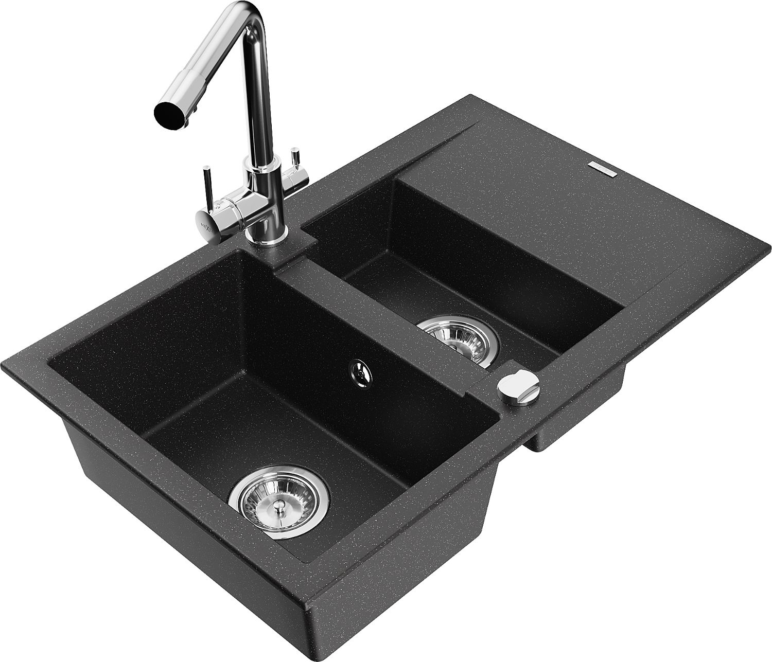 Mexen Gaspar granito kriauklė 1,5 skylių su drenažu ir virtuvės maišytuvu Duero, juodas/sidabrinis - 6507-73-671600-00