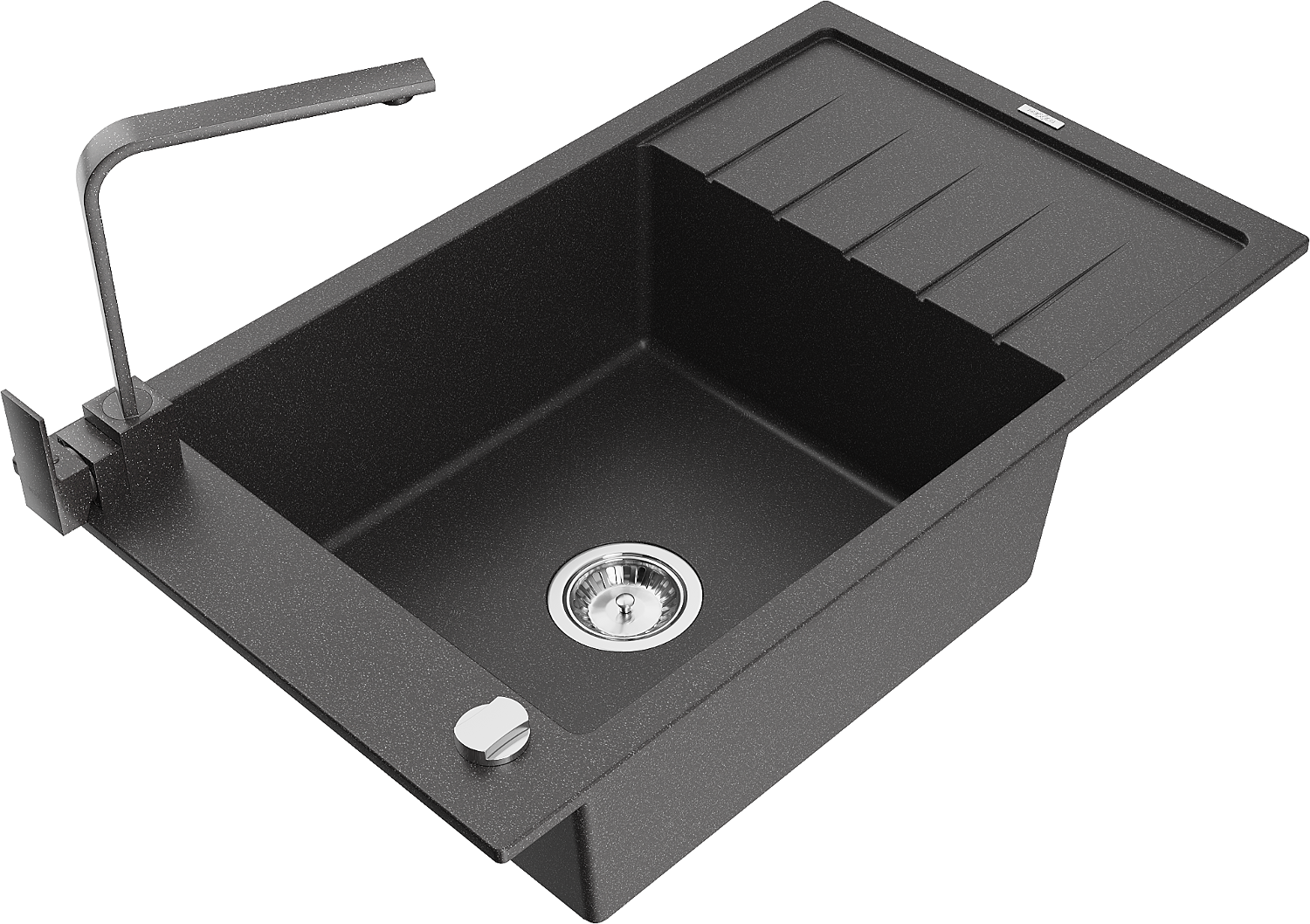 Mexen Elias vienos kameros granito kriauklė su nuvarvėjimo zona ir virtuvės maišytuvu Rita, juoda taškuota - 6511-76-670300-76