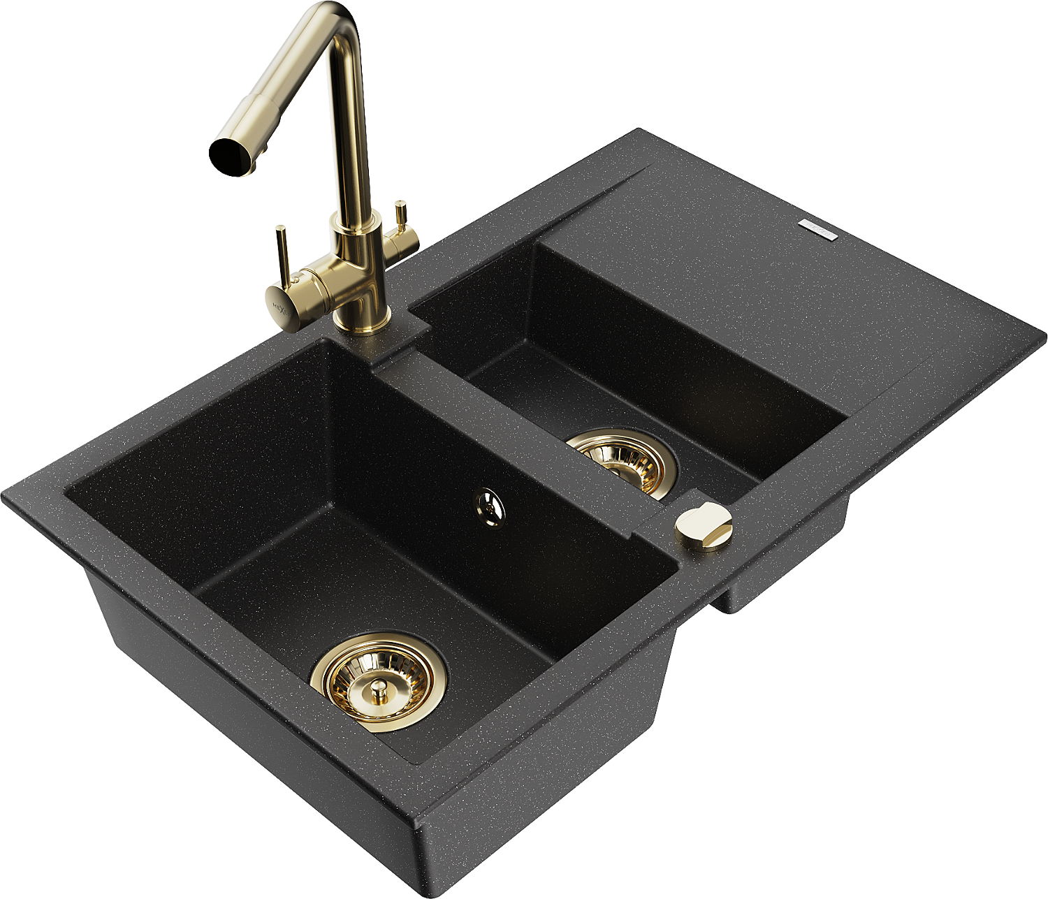 Mexen Gaspar granito plautuvė 1,5 skylių su nubėgimu ir virtuvės čiaupu Duero, juoda/sidabrinė - 6507-73-671600-50