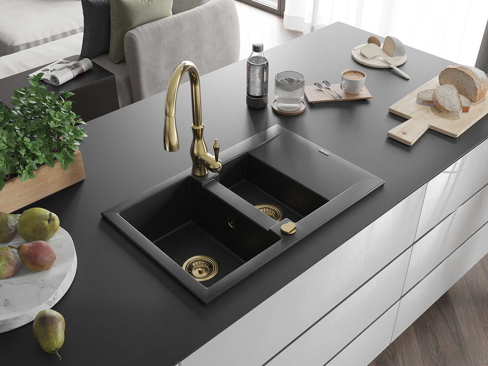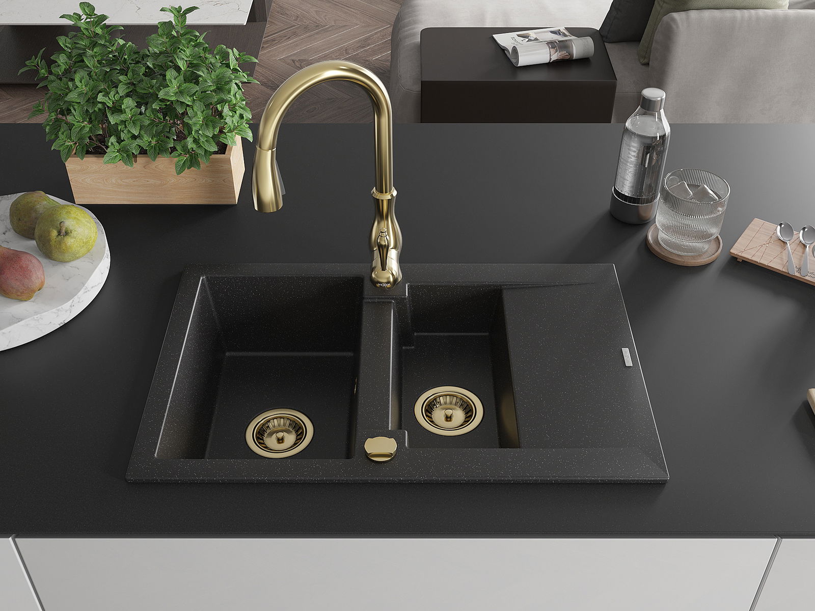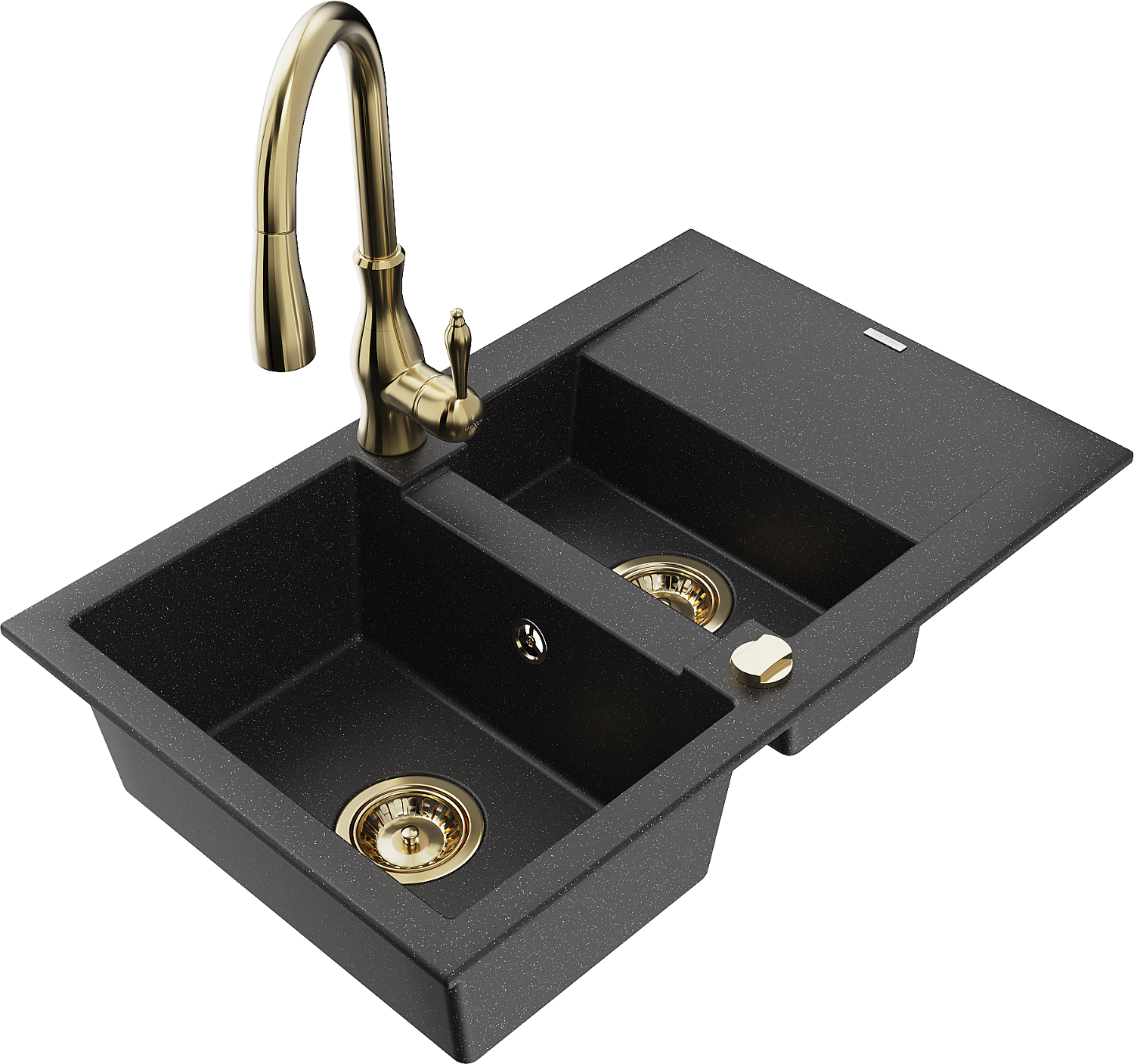 Mexen Gaspar granitinė 1,5 skylių kriauklė su nusausinimo vieta ir virtuviniu čiaupu Savita, juoda/sidabrinė