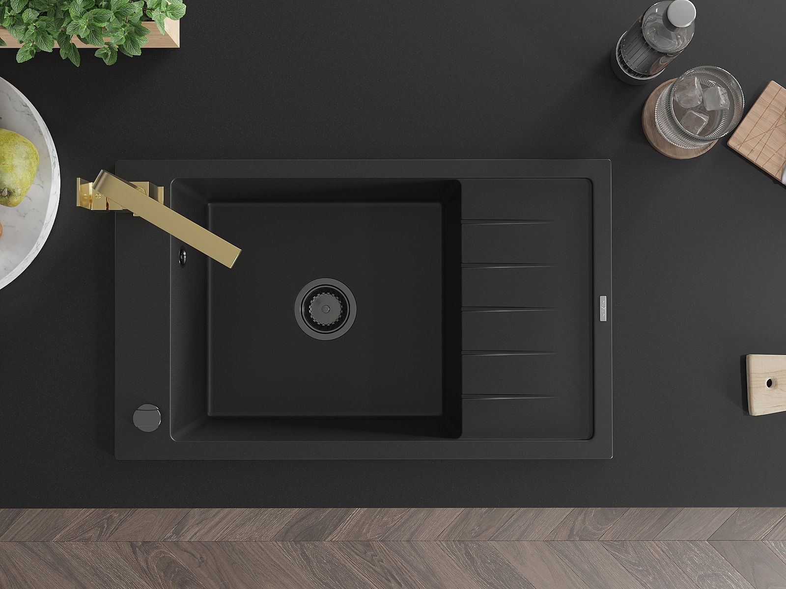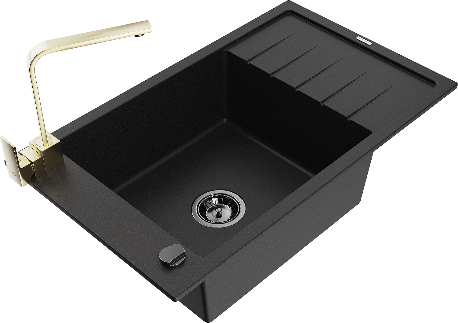 Mexen Elias granitinė kriauklė su viena kamera ir nusausintoju bei virtuvės maišytuvu Rita, juoda - 6511-77-670300-50-B