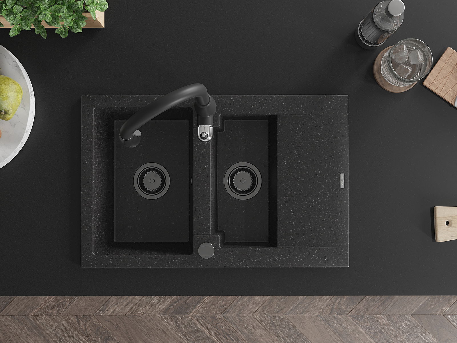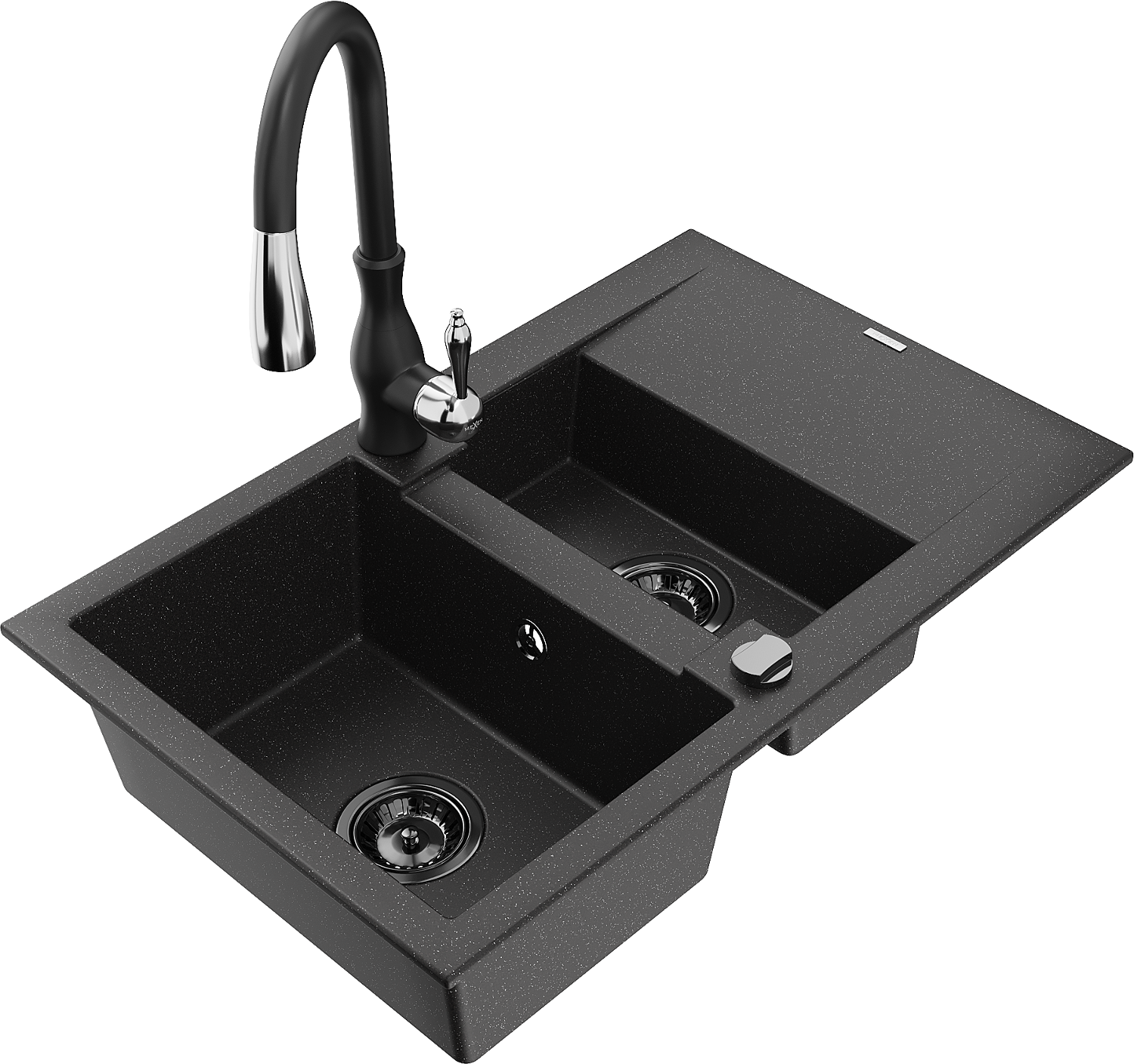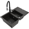 Mexen Gaspar granitinė 1,5 svirties kriauklė su indaplove ir virtuvine maišytuve Savita, juoda/sidabrinė