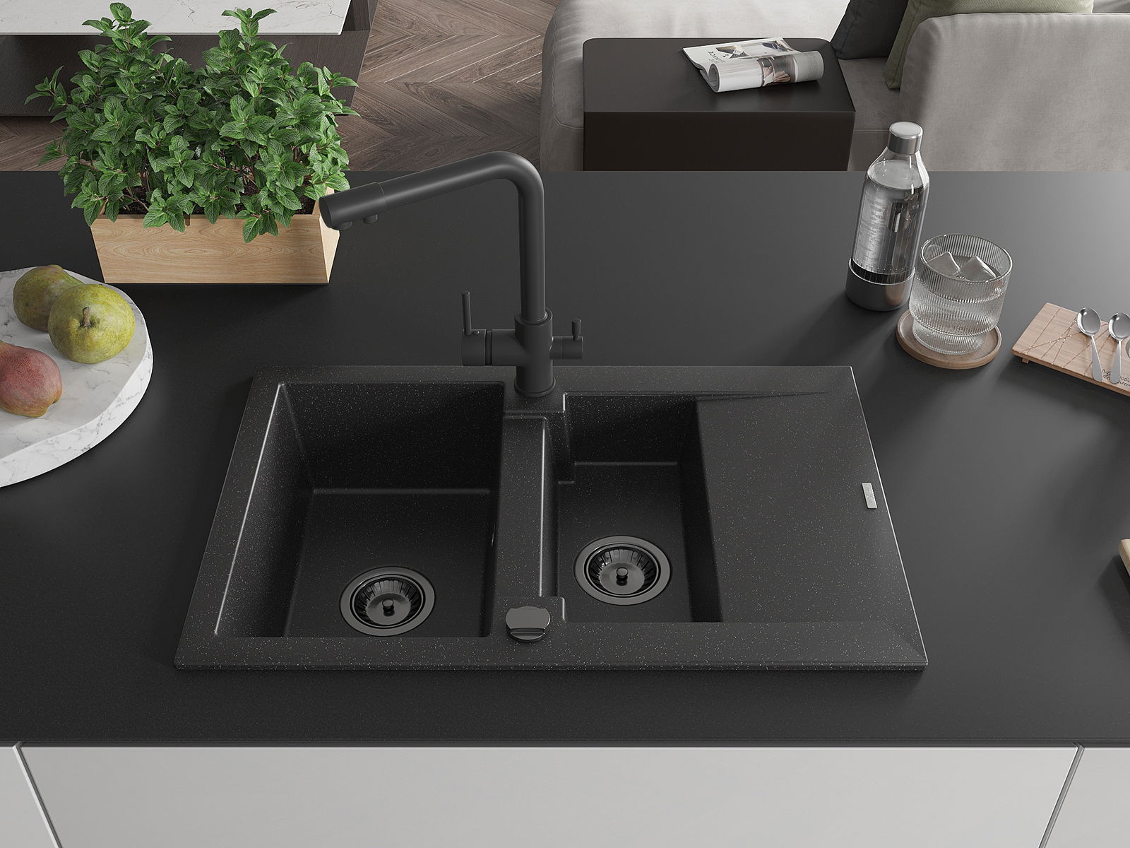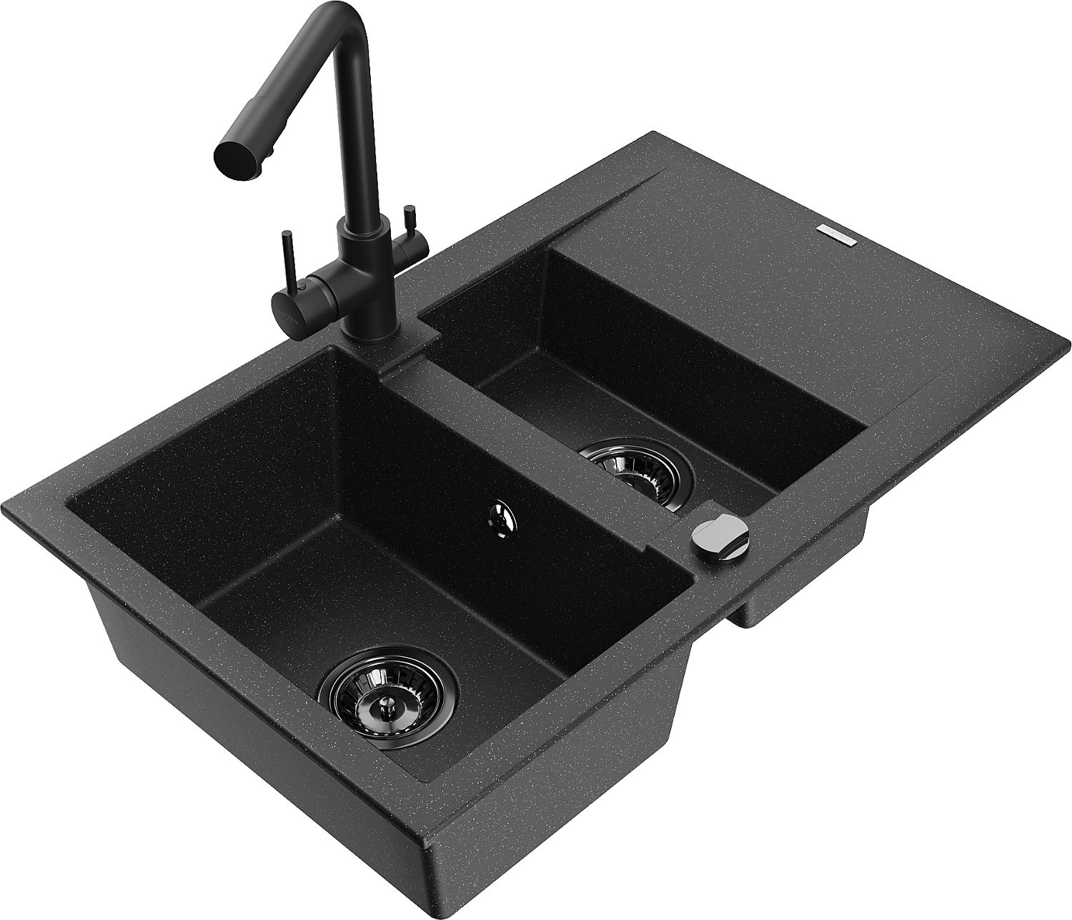 Mexen Gaspar 1,5 skyrių granitinė kriauklė su nuvarvėjimo lentyna ir virtuviniu maišytuvu Duero, juoda/sidabrinė