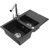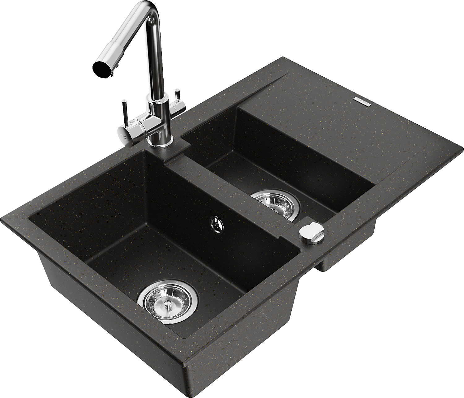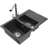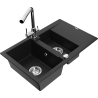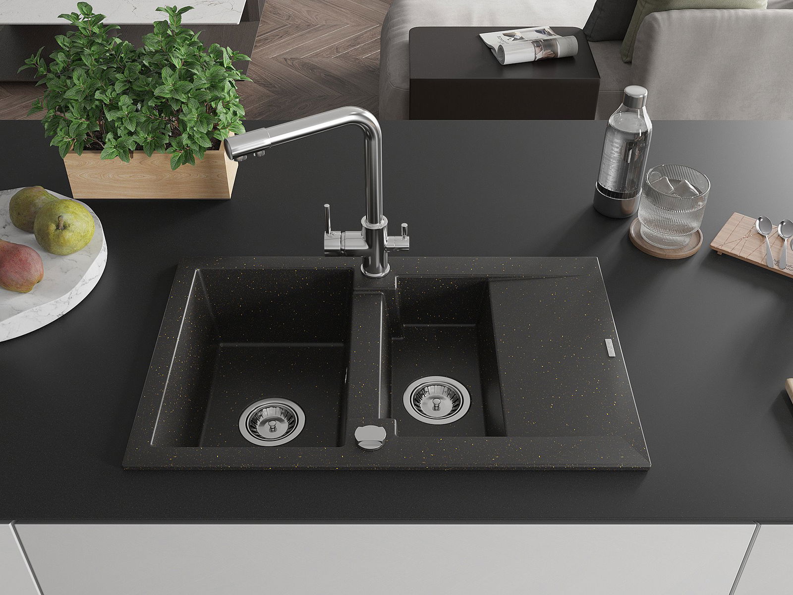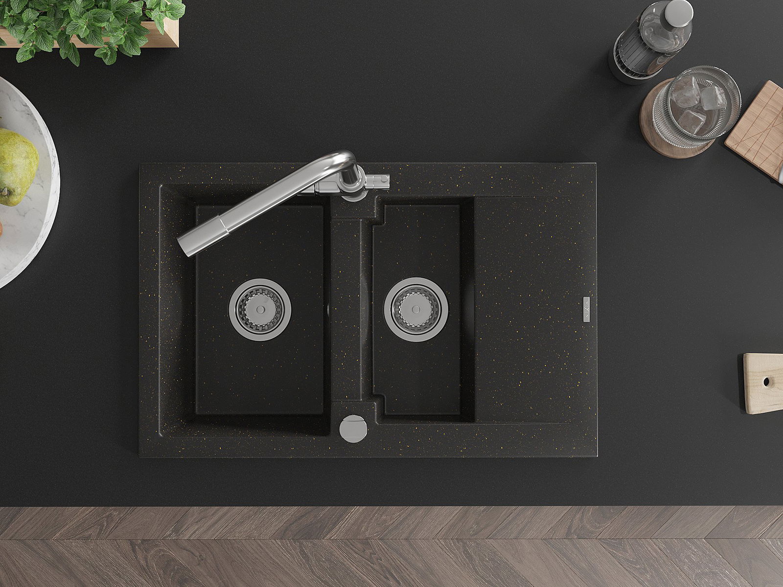 Mexen Gaspar granito plautuvė su 1,5 skyriaus ir nutekamu, su virtuviniu maišytuvu Duero, juoda/auksinė metaliko