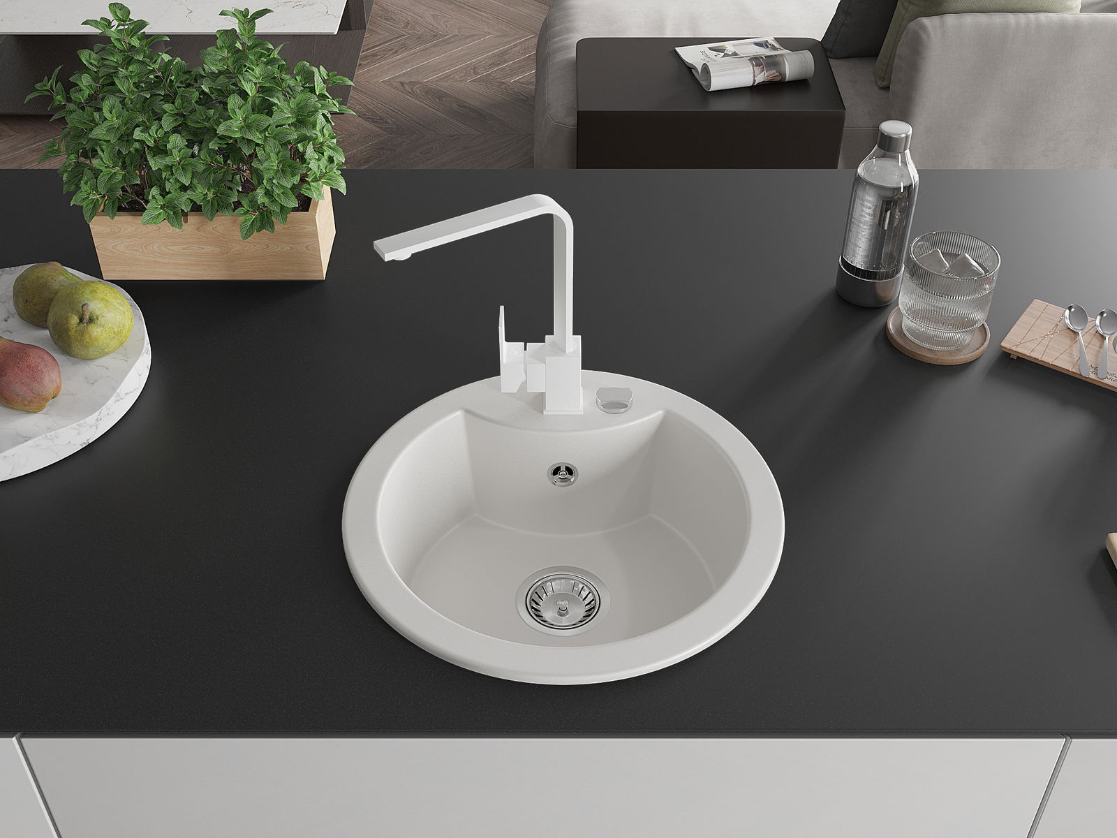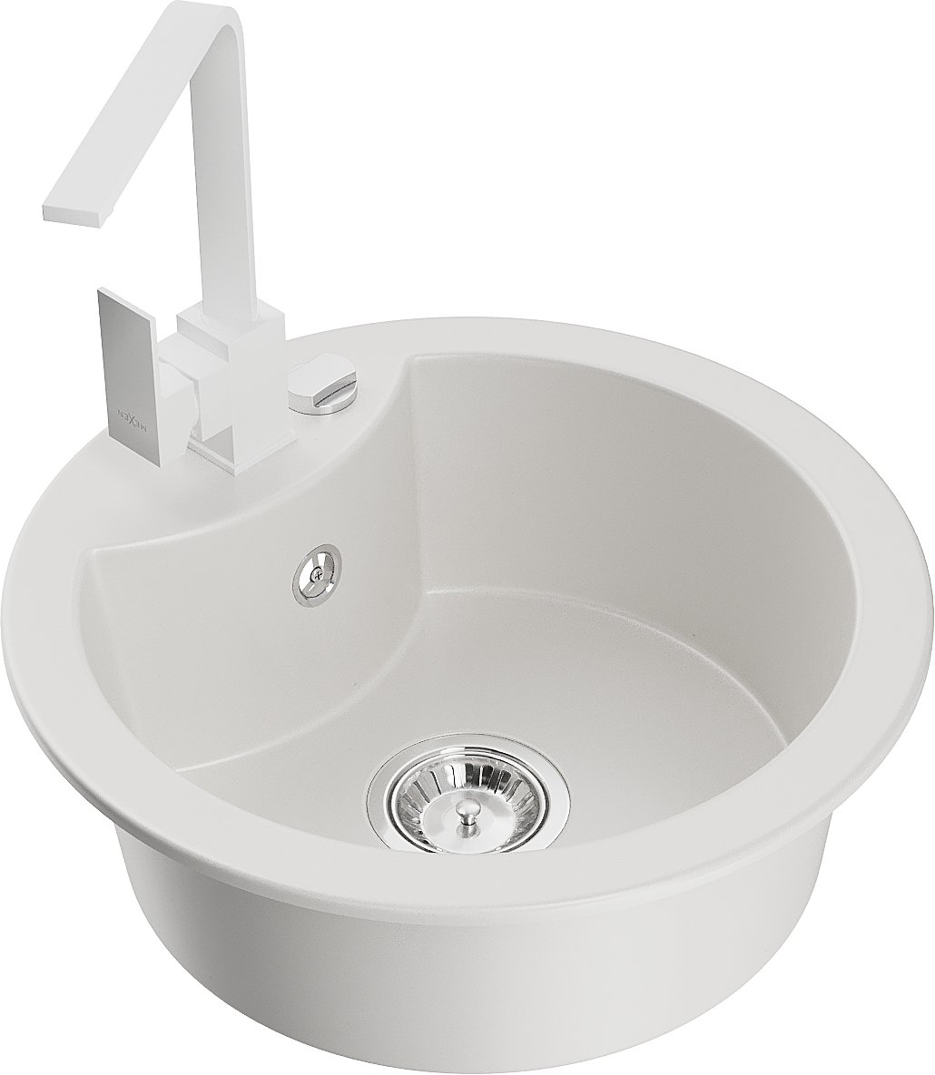Mexen Diego granitinė vienos plautuvės plautuvė su virtuviniu maišytuvu Rita, balta - 6512-20-670300-20
