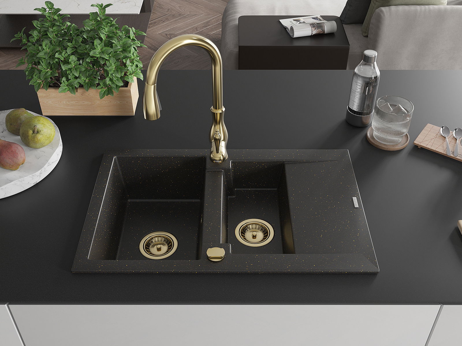 Mexen Gaspar granitinė plautuvė su 1,5 sekcijomis, nuvarvėtoju ir virtuviniu maišytuvu Savita, juoda/auksinė