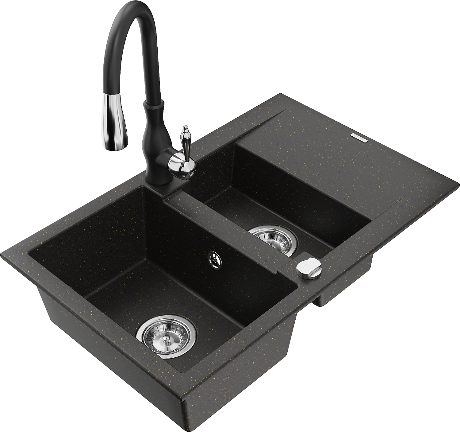 Mexen Gaspar granitinė 1,5 kameros plautuvė su nutekėjimu ir virtuviniu maišytuvu Savita, juoda/auksinė - 6507-75-672601-70