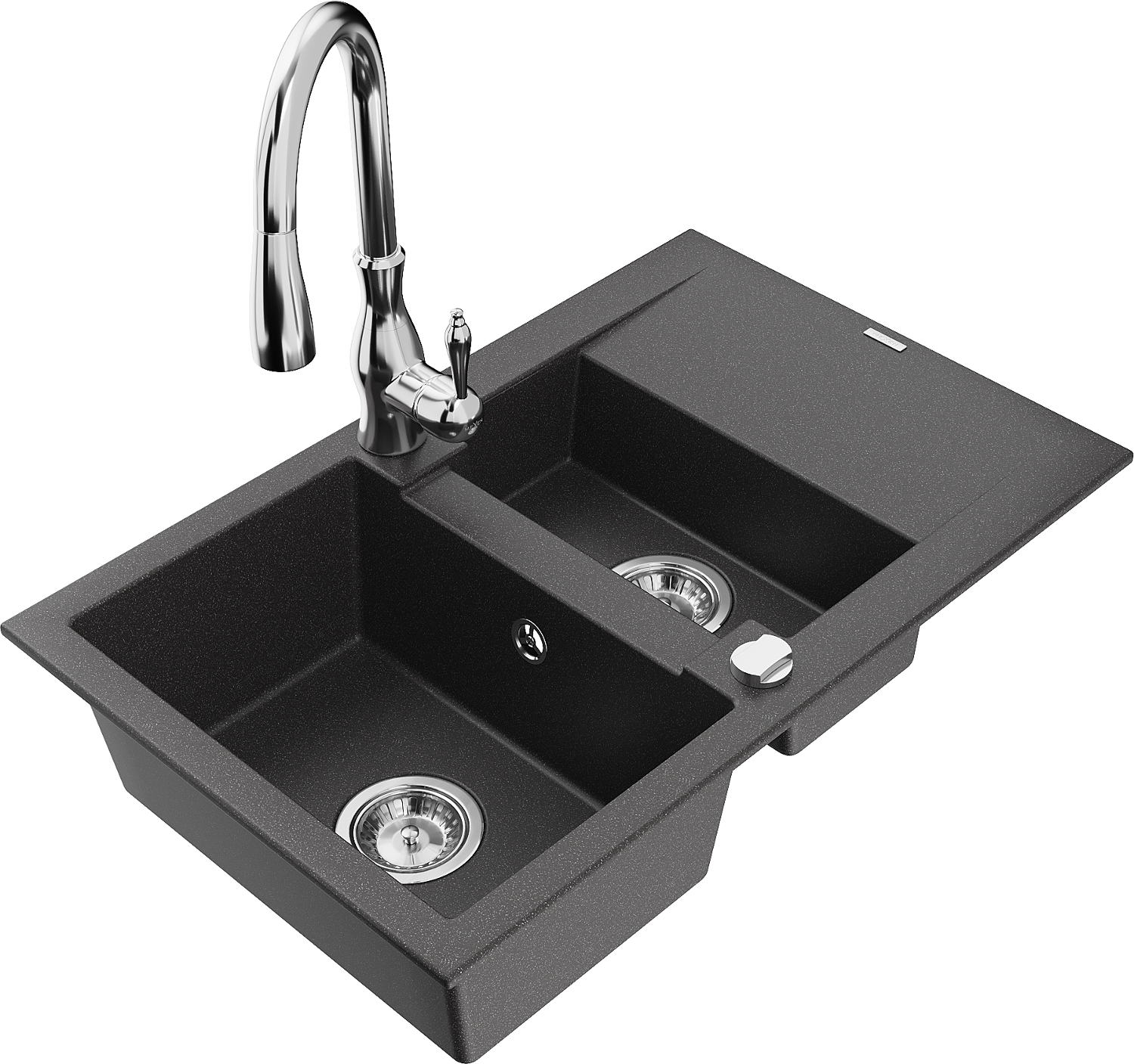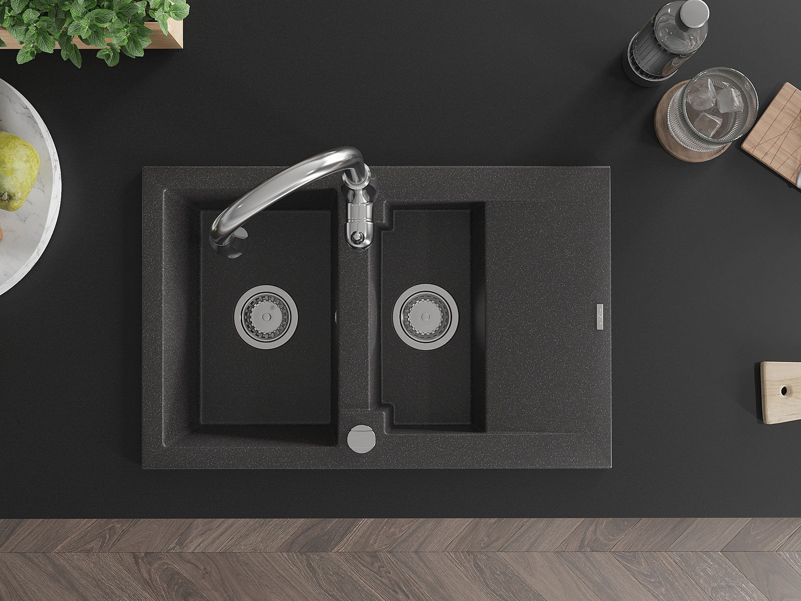 Mexen Gaspar granitinė 1,5 kamerų kriauklė su nuvarvėjimo paviršiumi ir virtuvės maišytuvu Savita, juoda dėmėta