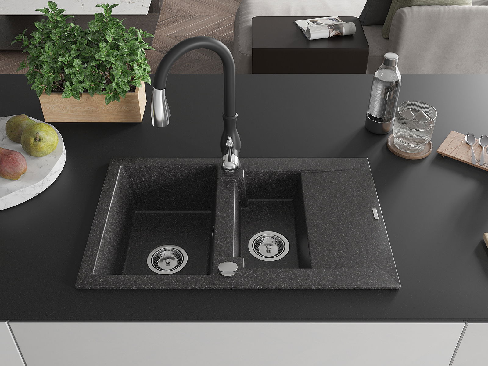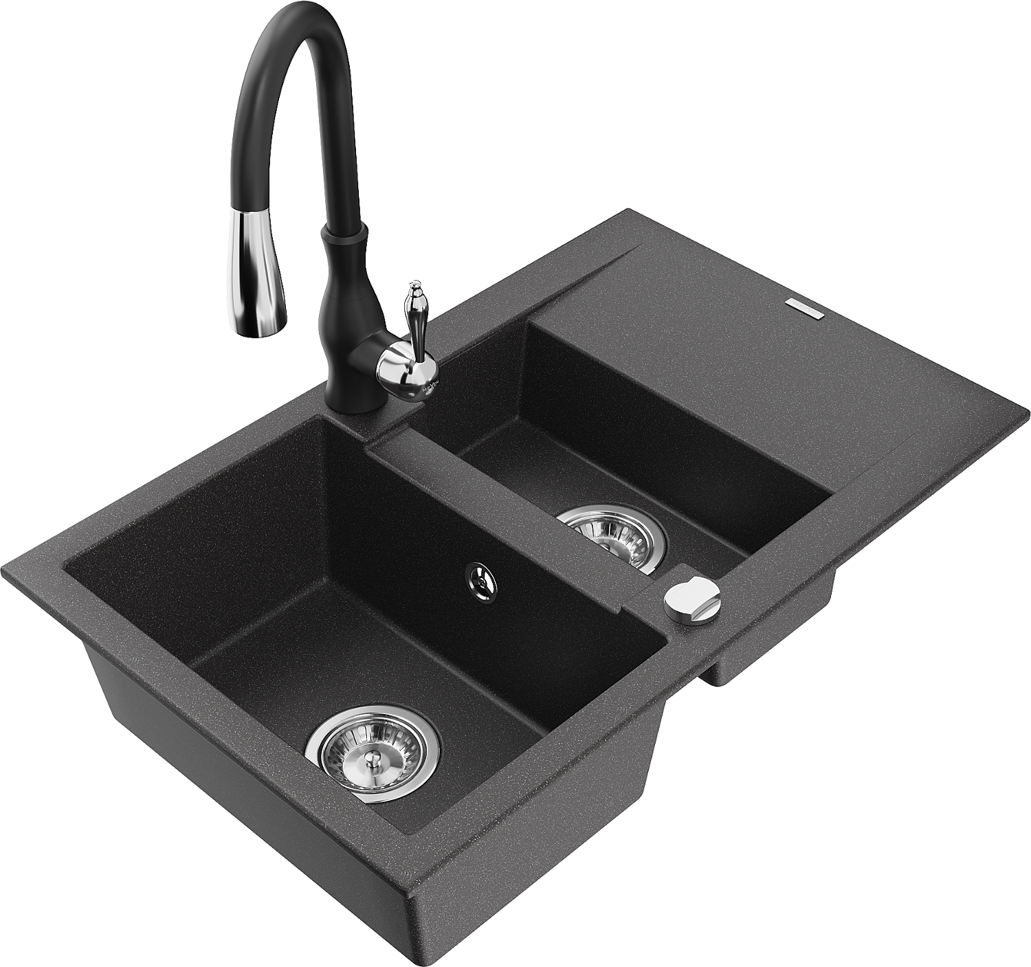 Mexen Gaspar granitinė plautuvė su 1,5 dubenimis, nutekėkliu ir virtuvės maišytuvu Savita, juoda taškuota