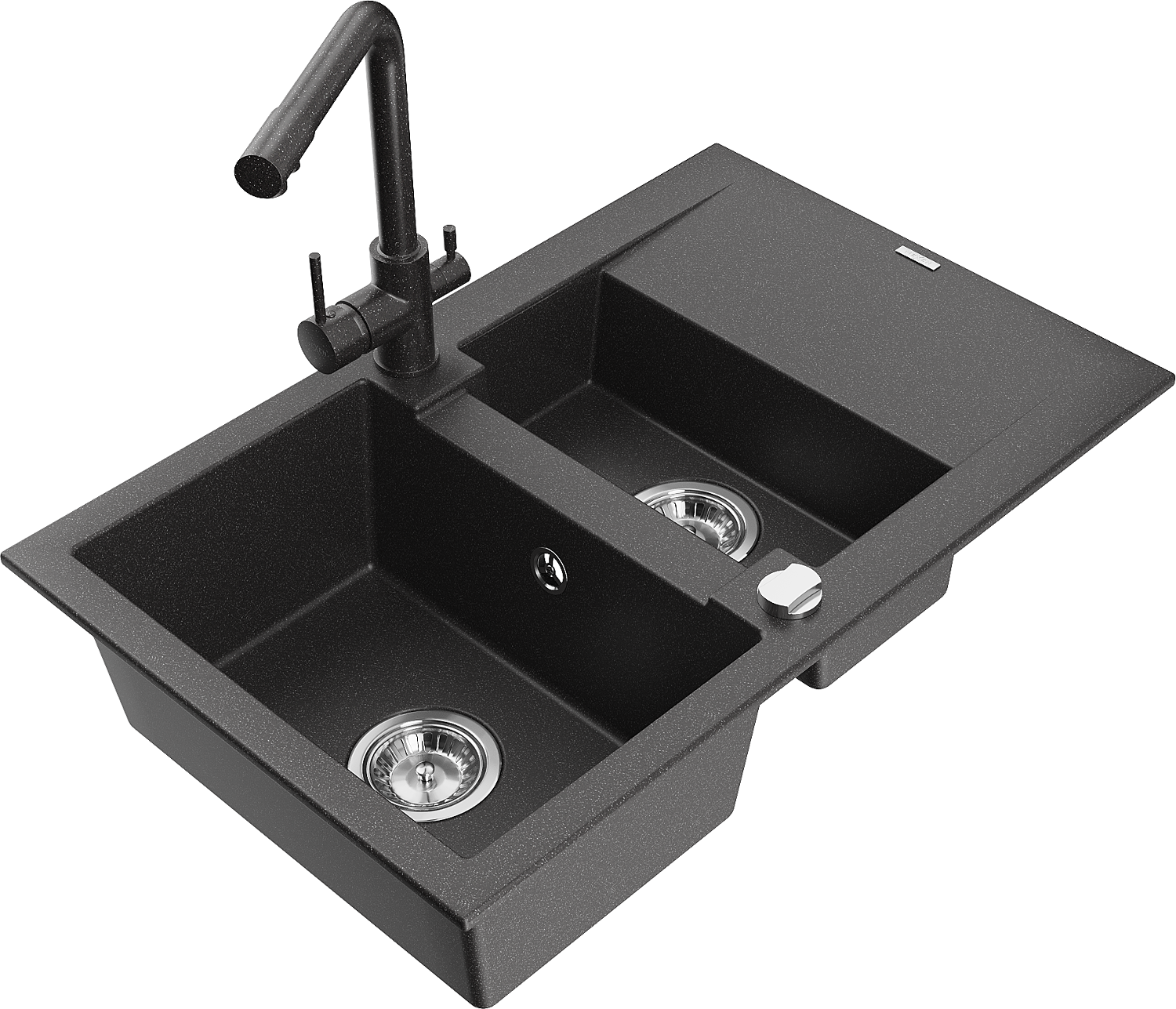 Mexen Gaspar granitinė plautuvė 1,5 kameros su varvekliu ir virtuviniu maišytuvu Duero, juodai dėmėta - 6507-76-671600-76