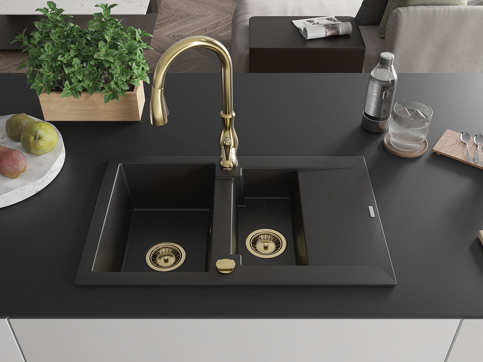 Mexen Gaspar granitinė 1,5 kameros plautuvė su nusausintuvu ir virtuviniu maišytuvu Savita, juoda - 6507-77-672601-50