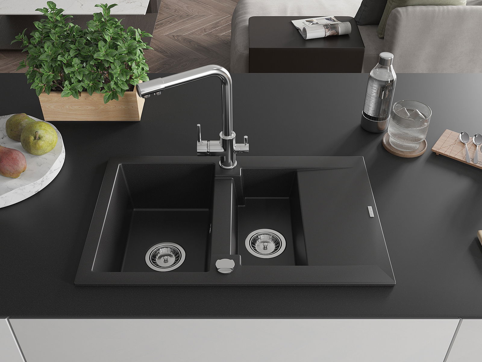 Kriauklės paviršius yra atsparūs dėmėms ir spalvos pasikeitimui, dėl kurio lengva valyti ir ilgą laiką išlaikyti savo spalvą. Estetinis ir praktiškai papildantis kiekvieną virtuvę.