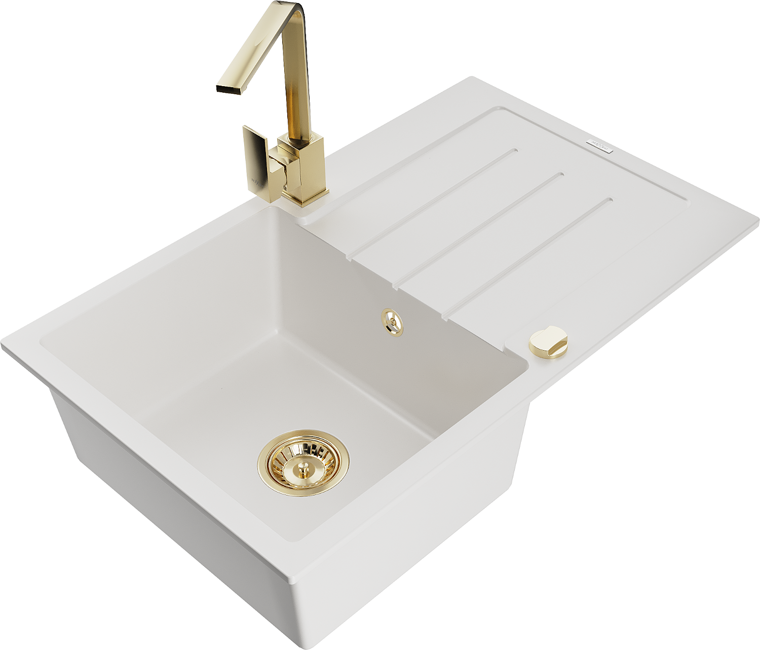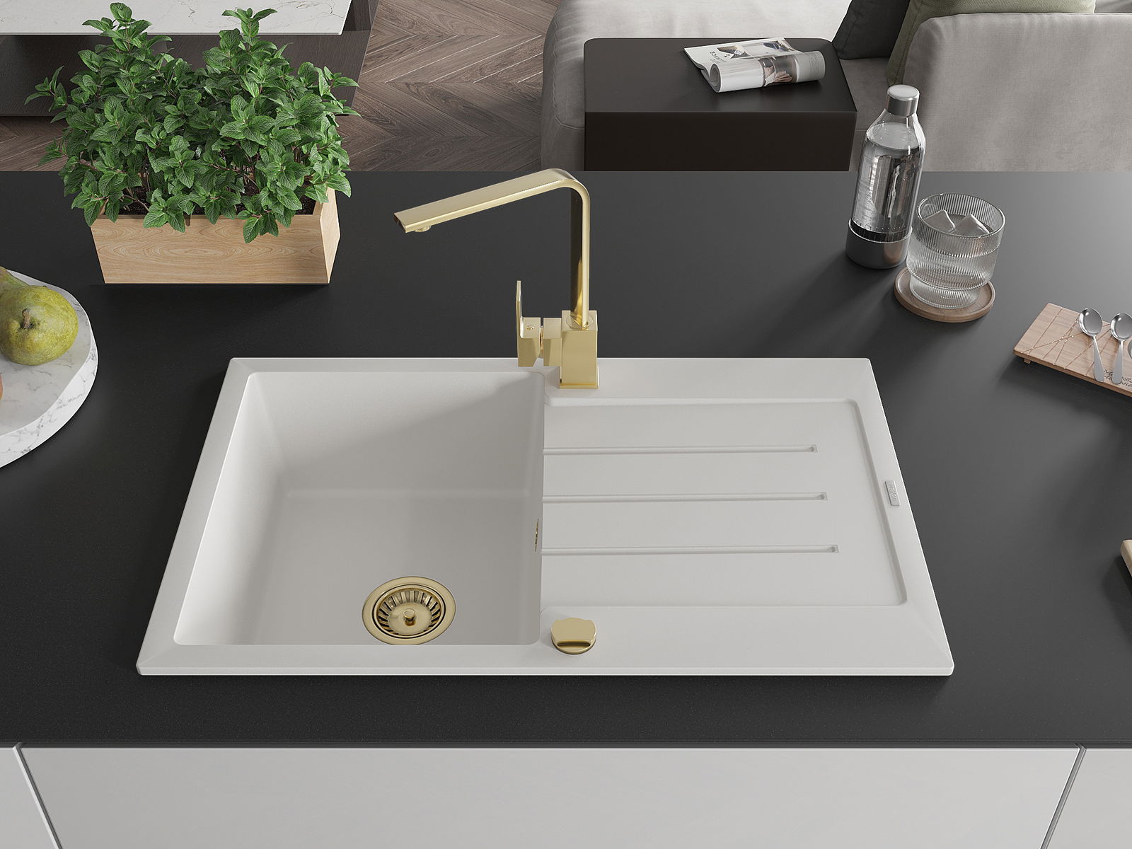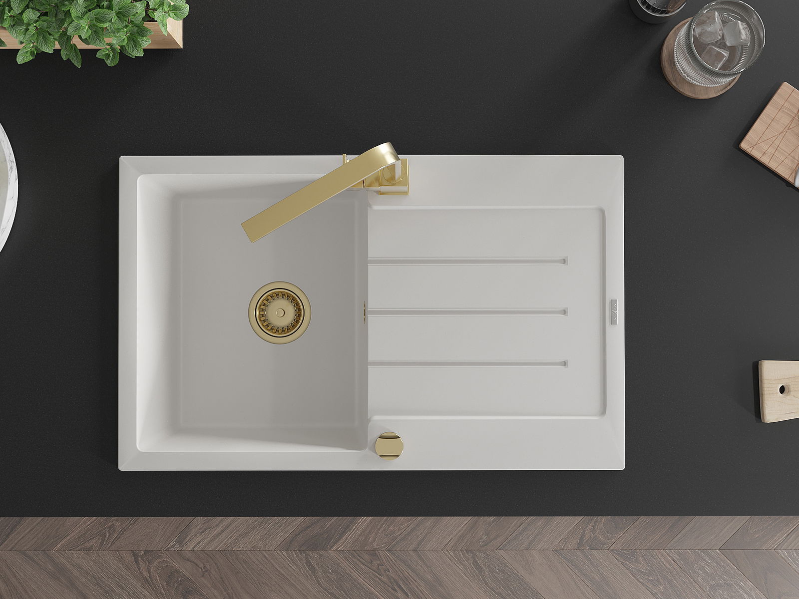 Mexen Bruno granitinis plautuvės komplektas su nuvarvėjimu ir Ritos virtuvės maišytuvu, baltas - 6513-20-670300-50