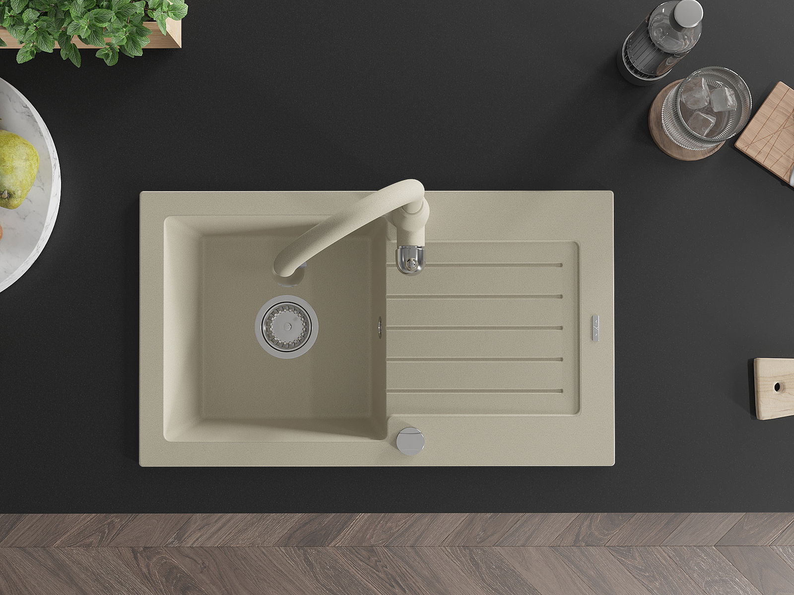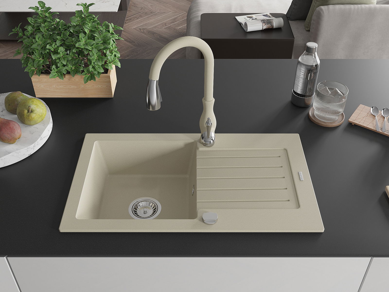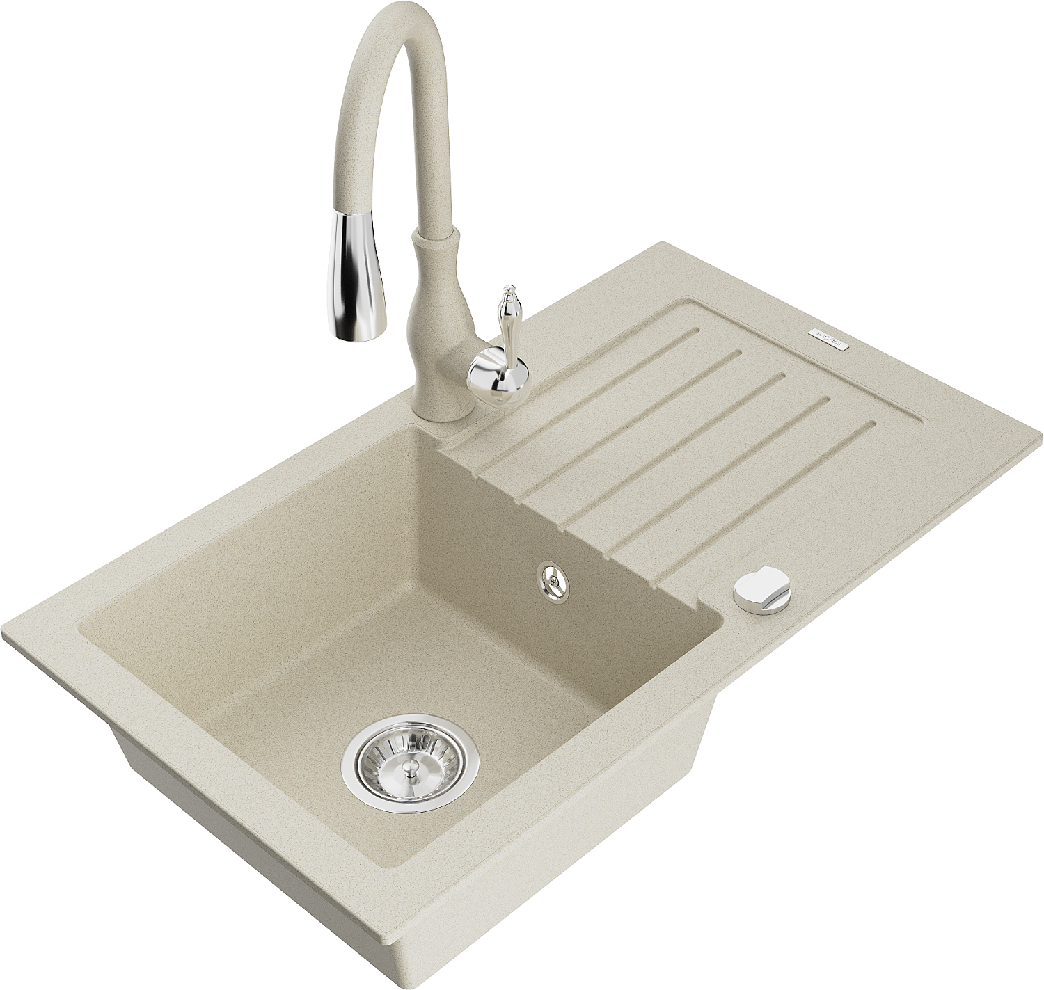 Mexen Pablo granitinė 1 skyriaus plautuvė su nuvarvėtu ir virtuvės maišytuvu Savita, smėlio spalvos - 6510-69-672601-69
