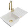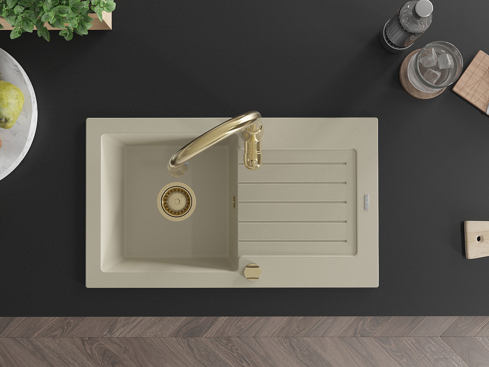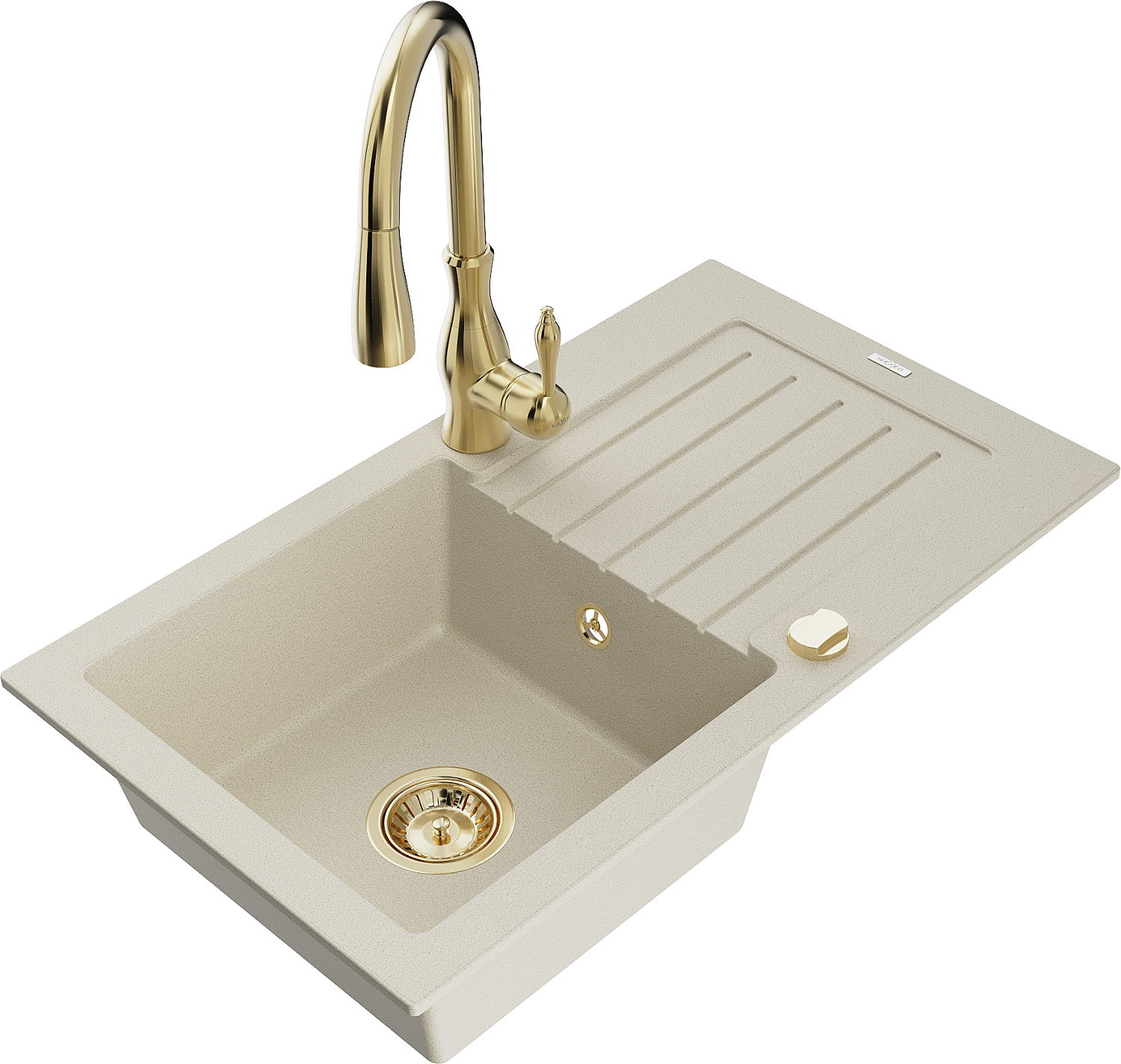 Mexen Pablo vienos komoros granito kriauklė su nusausintuvu ir virtuvės maišytuvu Savita, smėlio spalvos - 6510-69-672601-50