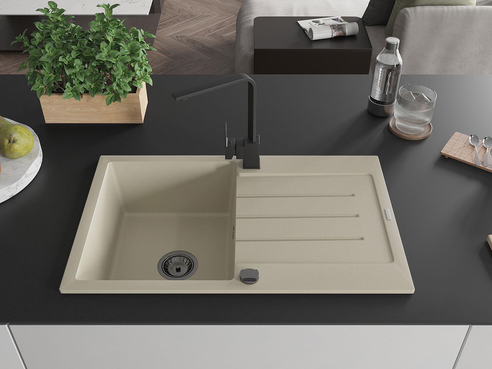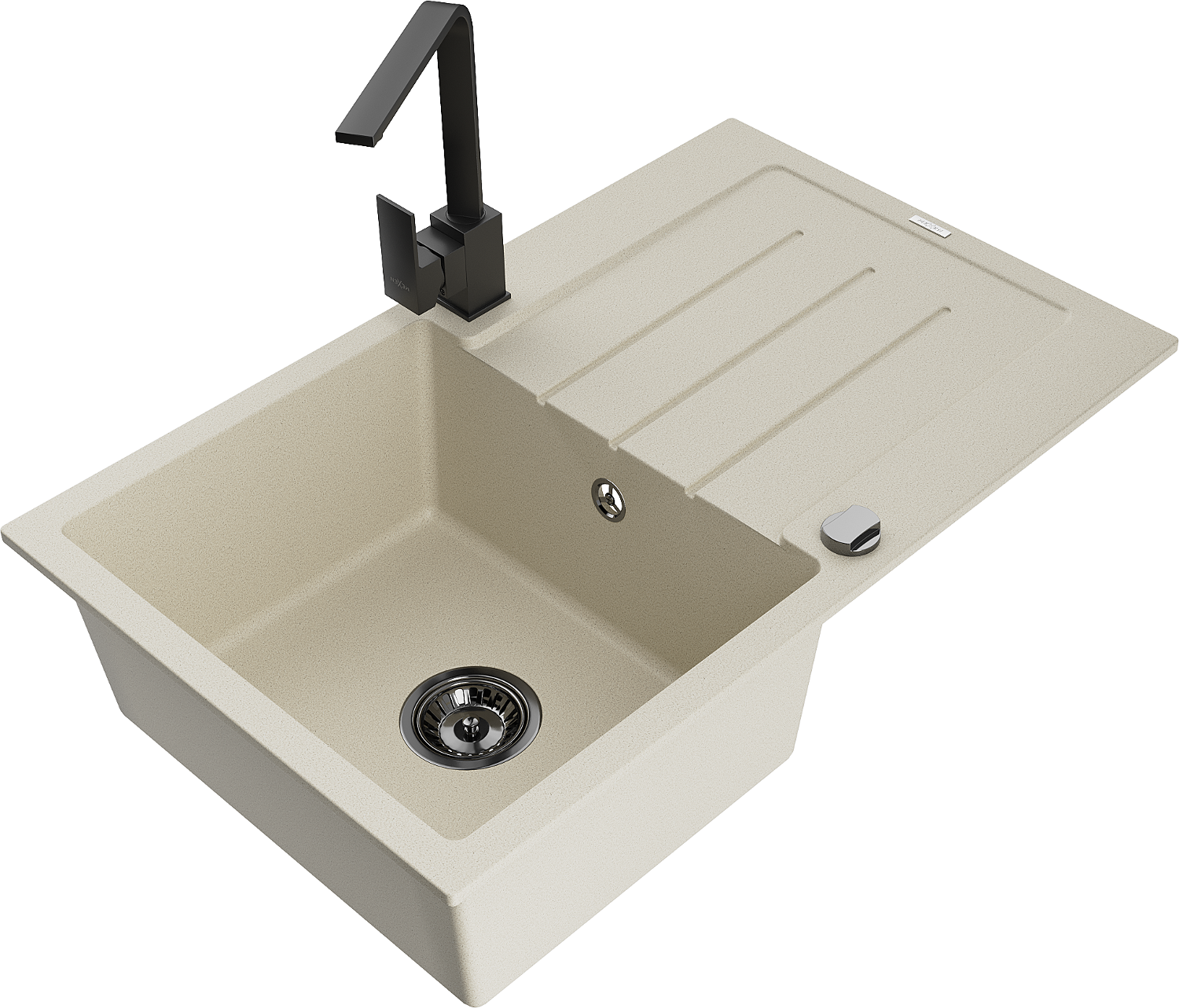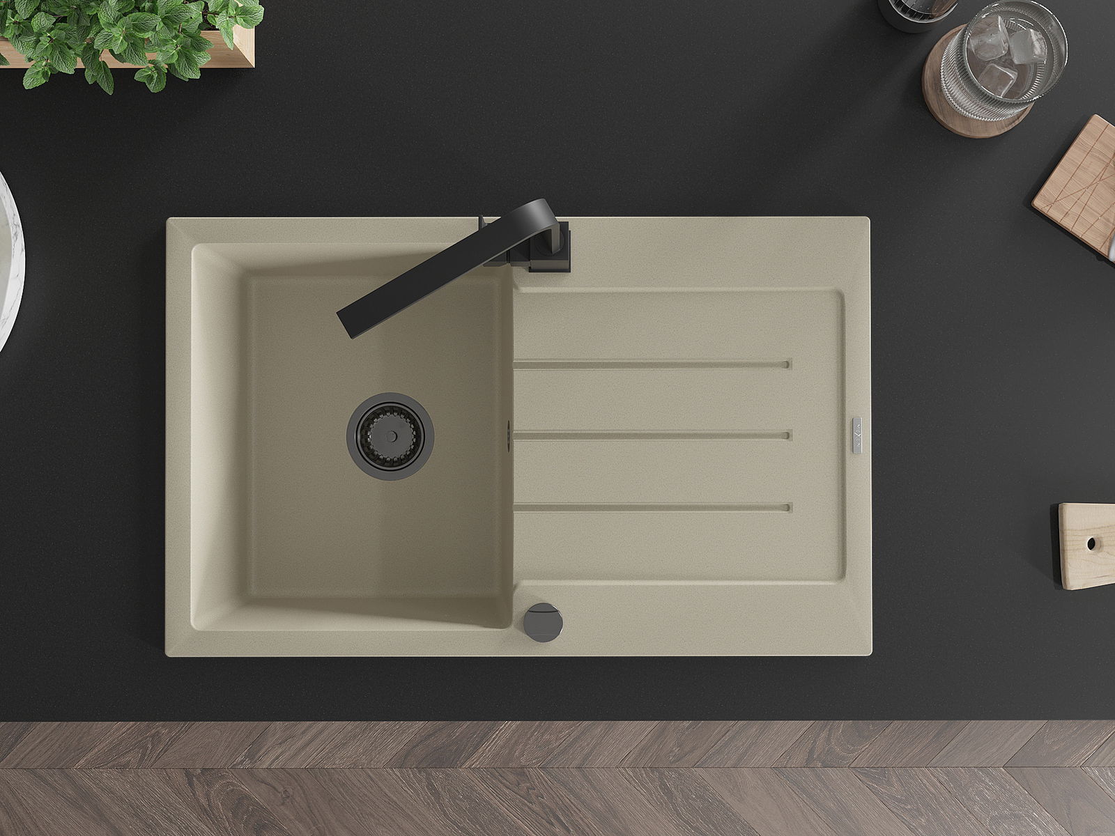 Mexen Bruno granitinis vienos kameros plautuvė su nutekėjimo skyriumi ir virtuviniu maišytuvu Rita, smėlio - 6513-69-670300-70