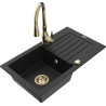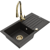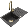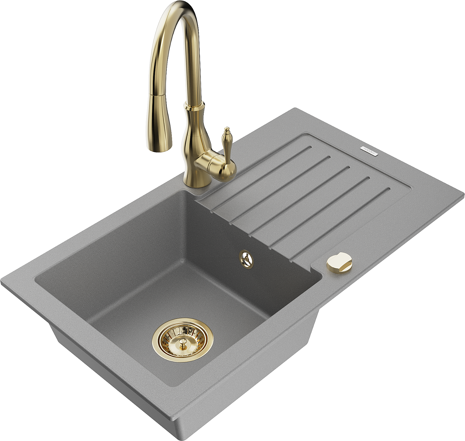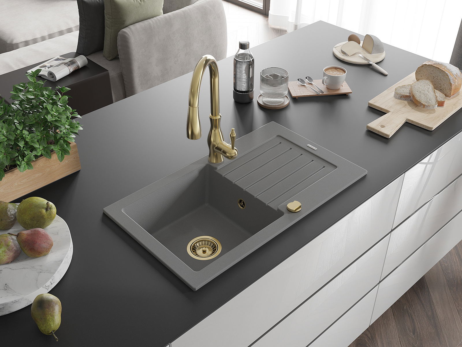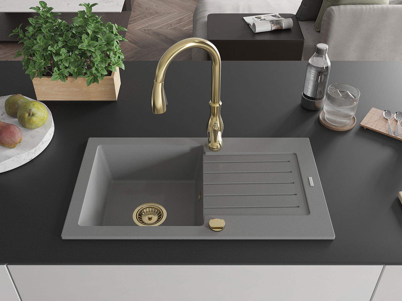 Mexen Pablo granitinė vienos kameros kriauklė su nutekėjimu ir virtuviniu maišytuvu Savita, pilka - 6510-71-672601-50