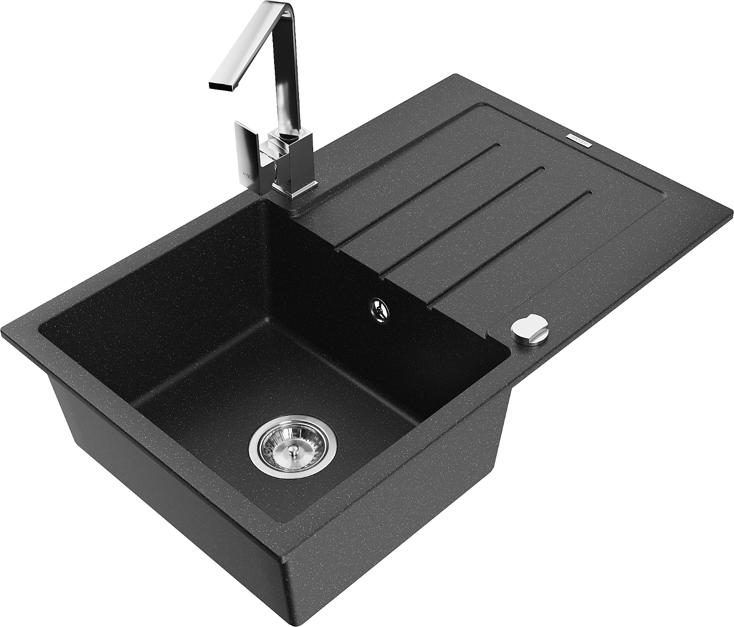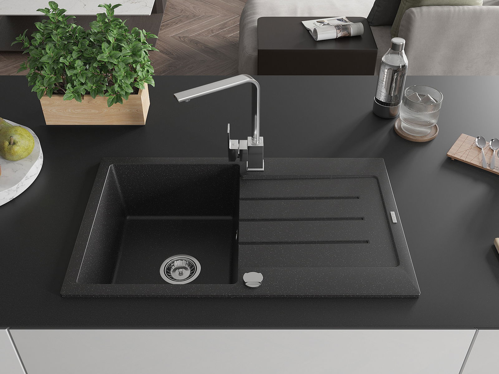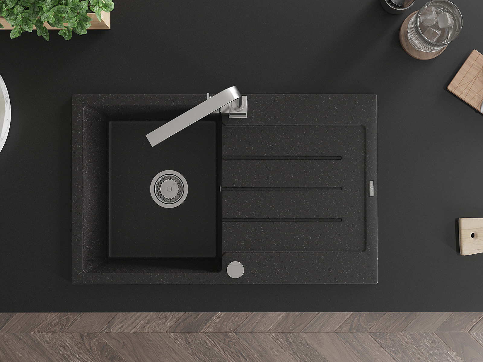 Mexen Bruno granitinė vienos kameros plautuvė su nubėgimo sistema ir virtuviniu maišytuvu Rita, juoda/sidabrinis metalikas