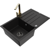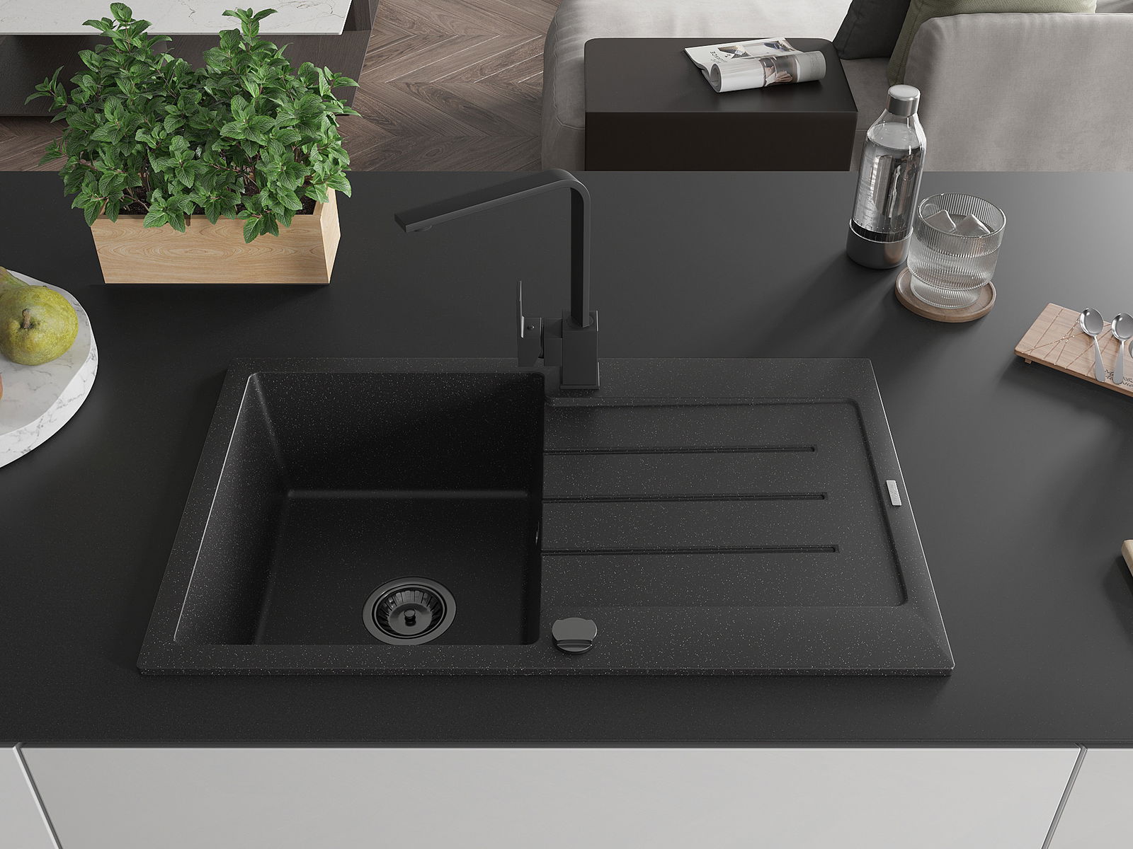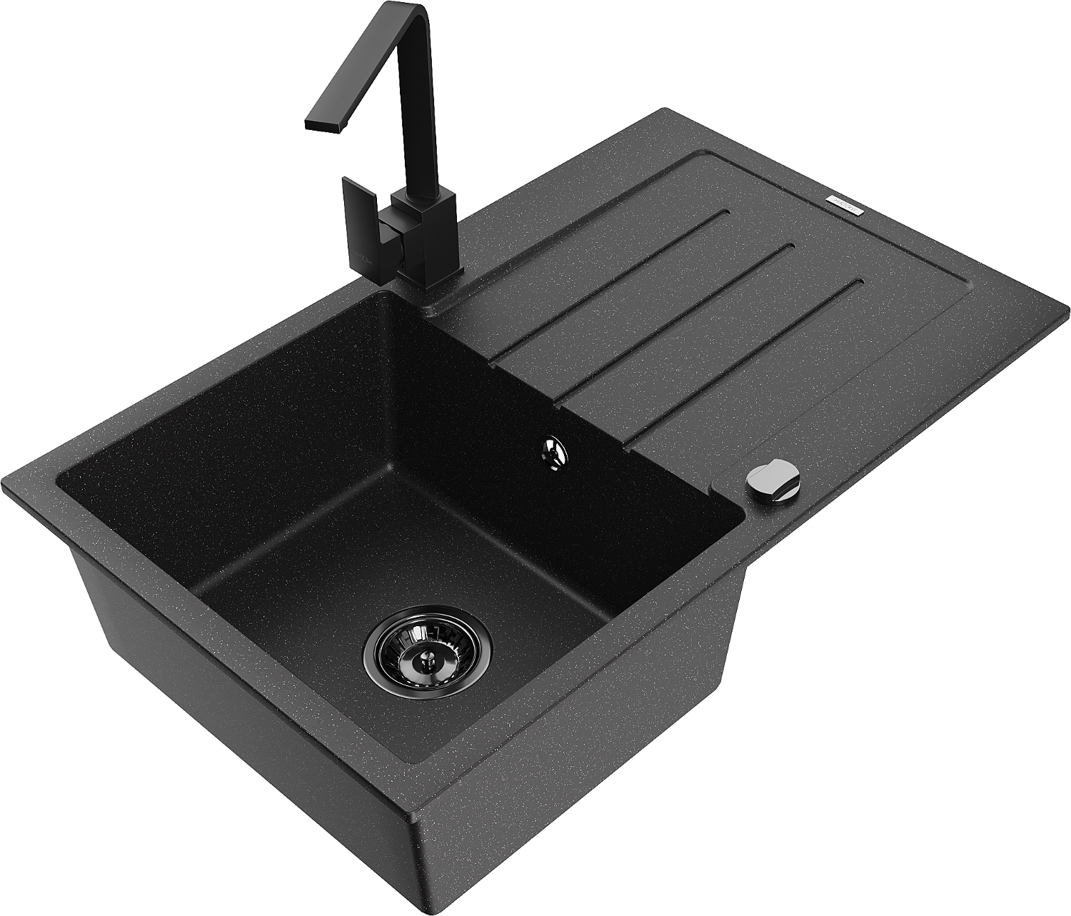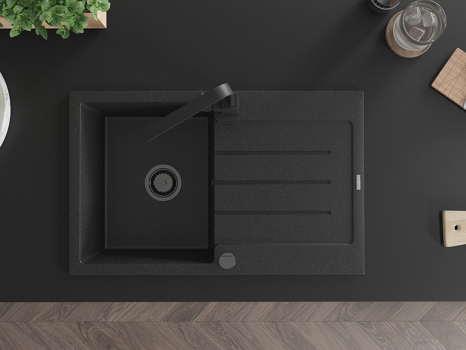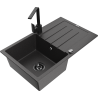 Mexen Bruno granitinė vienos kameros kriauklė su sifonu ir virtuviniu maišytuvu Rita, juoda/sidabrinis metalikas