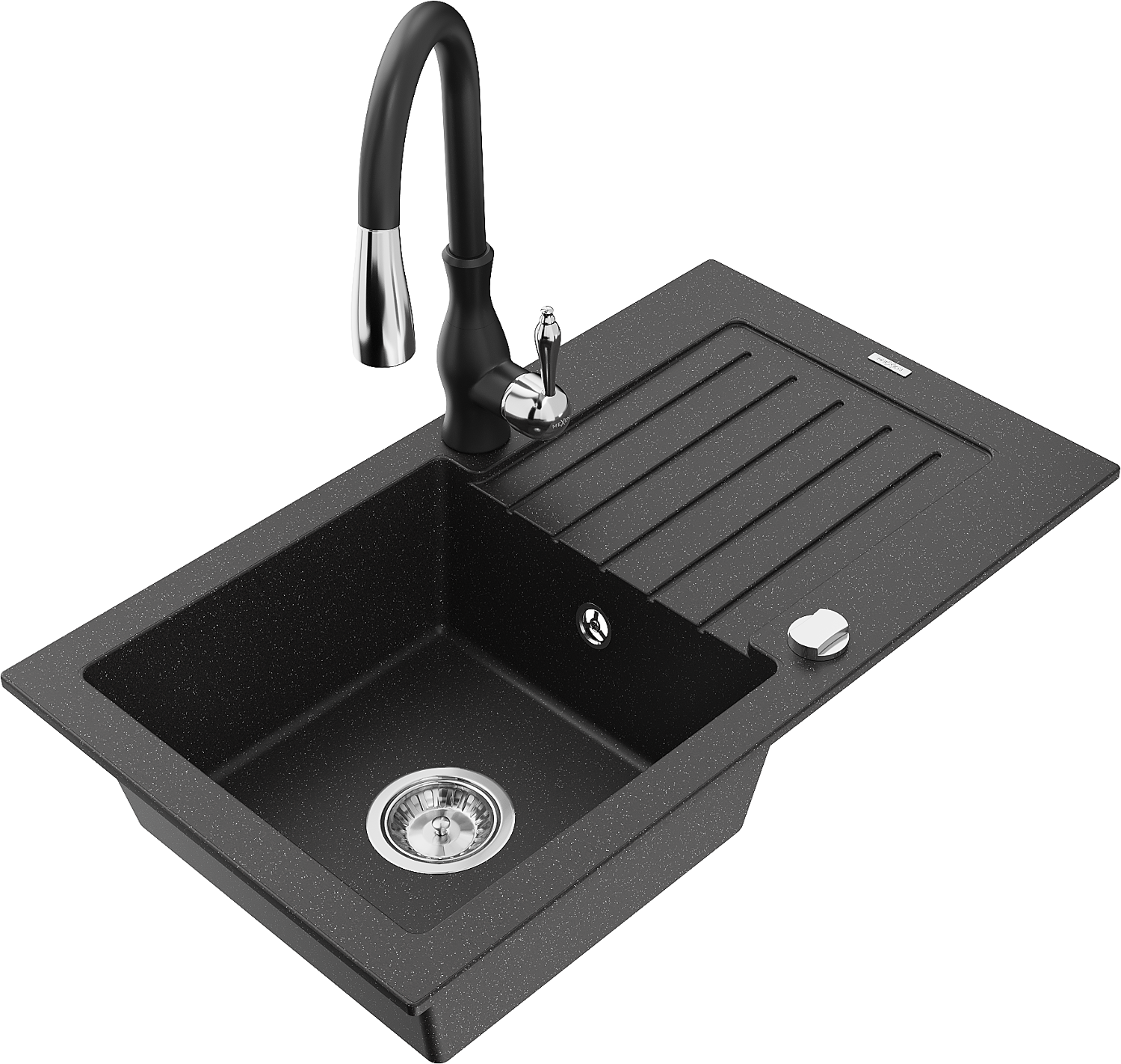 Mexen Pablo granito plautuvė 1 kamerų su nutekėjimu bei virtuviniu čiaupu Savita, juoda/sidabrinė metalika - 6510-73-672601-70