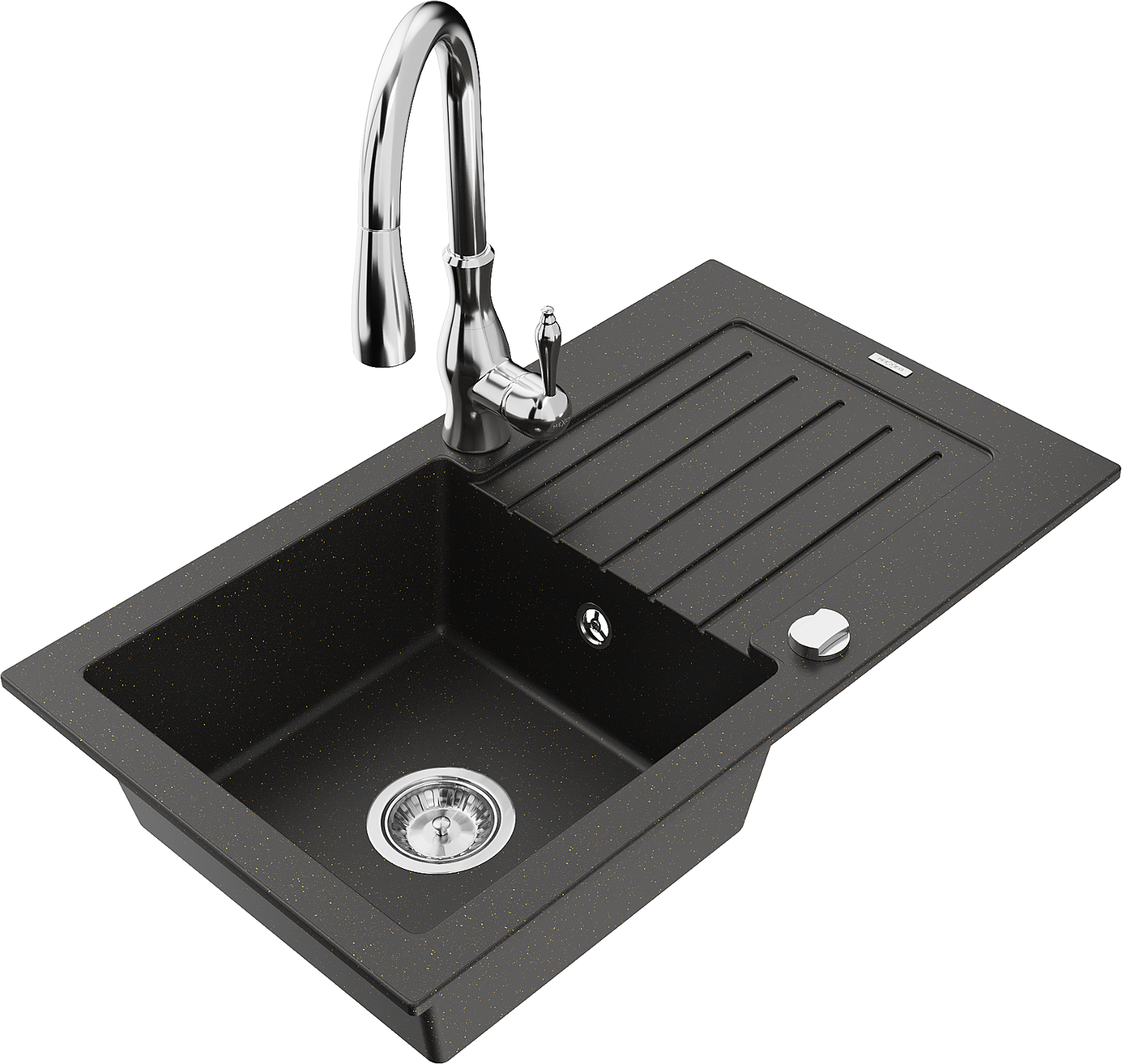 Mexen Pablo vienos kameros granitinė plautuvė su lašinamąja ir virtuviniu maišytuvu Savita, juoda/auksinė metalo spalva