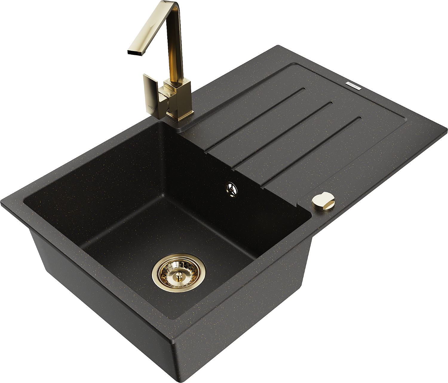 Mexen Bruno granitinė plautuvė su 1 dubeniu ir nutekėjimu bei virtuviniu maišytuvu Rita, juoda/auksinė metalik - 6513-75-670300?