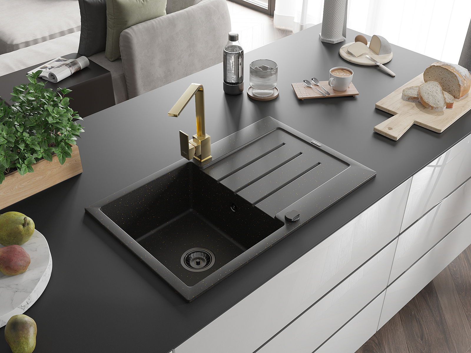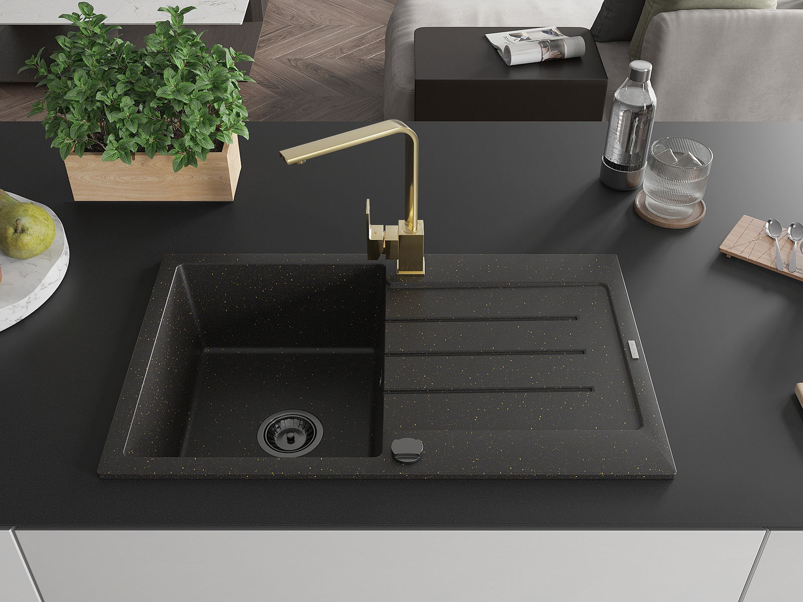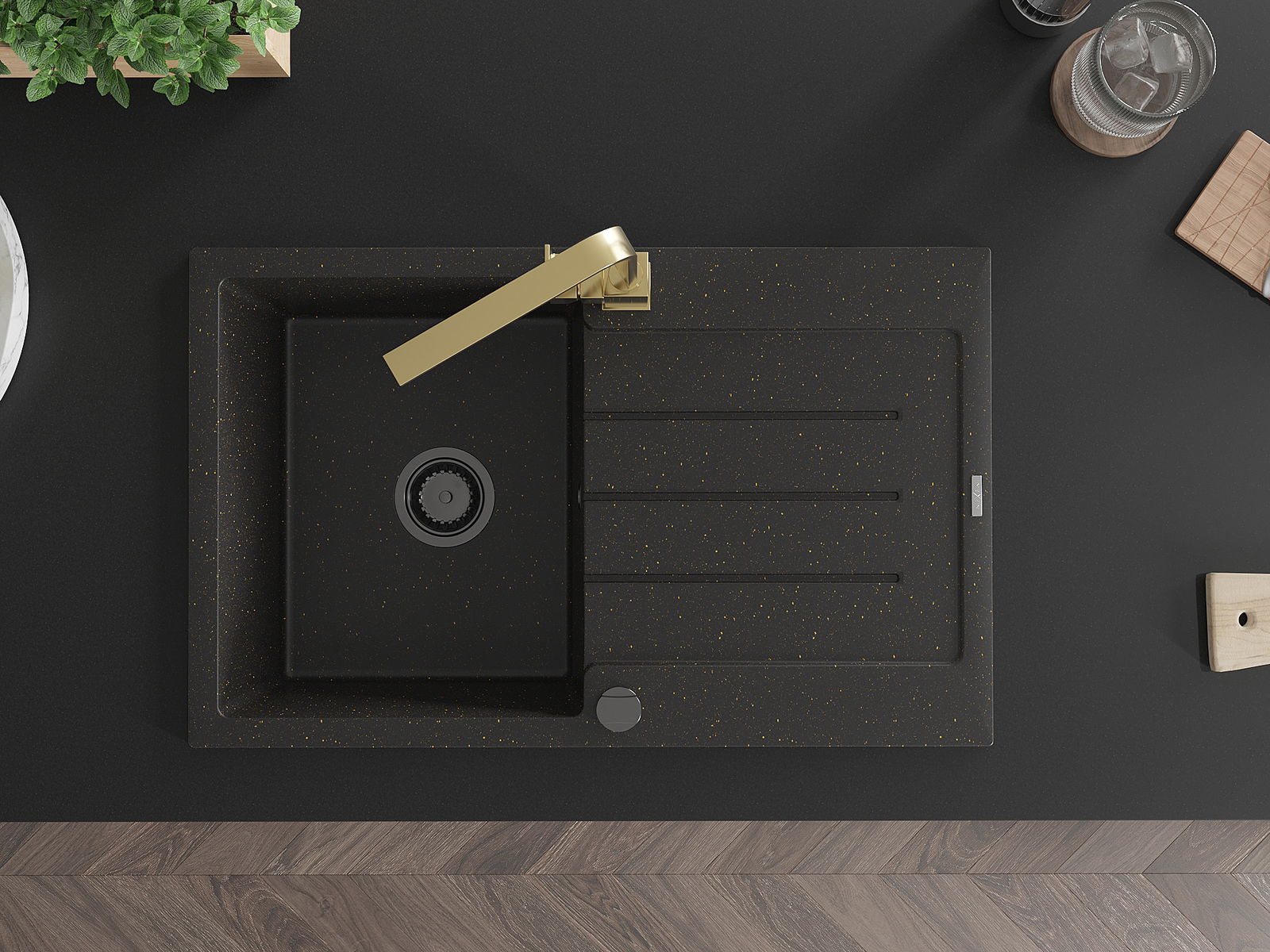 Mexen Bruno granitinė vienos kameros kriauklė su stalviršiu ir virtuviniu maišytuvu Rita, juoda/auksinė metalo spalva